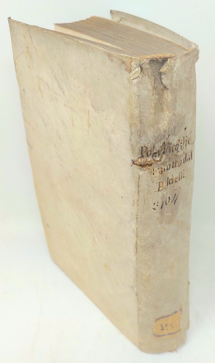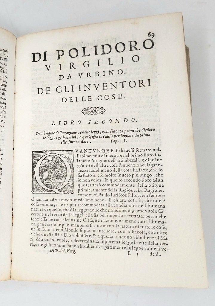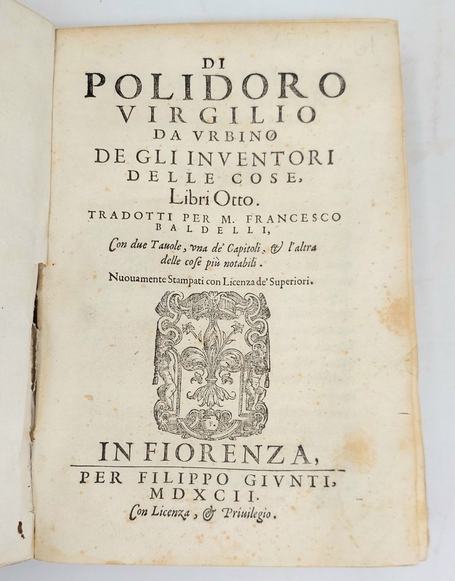 >in-4 piccolo (217x150 mm), pp. (24), 426, (46), legatura coeva in pergamena, titolo ms. al dorso (con qualche difetto al dorso). Impresa tipogr. al frontespizio, iniz. xilogr., car. tondo e passi in corsivo. Dedica del traduttore, il poeta Francesco Baldelli, ad Ottavio Imperiali ed altra dell'autore a Lodov. Odassio dat. 5 agosto 1499. Ristampa di questa traduzione (apparsa nel 1587 presso gli stessi Giunti), e seconda traduzione dopo quella di P. Lauro (1543). Celebre interessante opera enciclopedica, apparsa in latino nel 1499; ebbe immensa diffusione e varie traduzioni, ma, essendo impostata secondo criteri razionalistici nella spiegazione dell'origine delle cose, venne messa all'Indice. L'autore (Urbino 1470 ca.- 1555) fu storico e letterato, insegnante a Bologna; stabilitosi in Inghilterra, ebbe il favore dei re Enrico VII, che gli affidò l'incarico di scrivere la "Historia Anglica", e di Enrico VIII; nel 1498 aveva pubblicato il "Proverbiorum libellus" che precede di due anni gli "Adagia" di Erasmo, da cui si dolse di non essere stato ricordato, ma col quale tuttavia mantenne profonda amicizia. Ottimo esemplare. Manca all'Adams. Camerini II, 189. BMC 720 (ed. 1587).