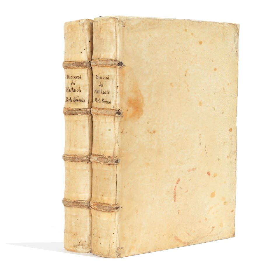 2 vol. in-folio (350 x 240mm.), titolo con marca tipografica, ritratto a tutta pagina di Mattioli all'interno di un’elaborata cornice, oltre 900 grandi xilografie di piante, erbe, animali, pesci e insetti, leggere bruniture sparse, specialmente al volume I, piccoli punti di inchiostro/ ossidazione, titolo e due altre carte riparate, volume 2 con finale a1 e a6 riparate in margini, rilegato in pergemen coeva, estremità del dorso e bordi restaurati.
