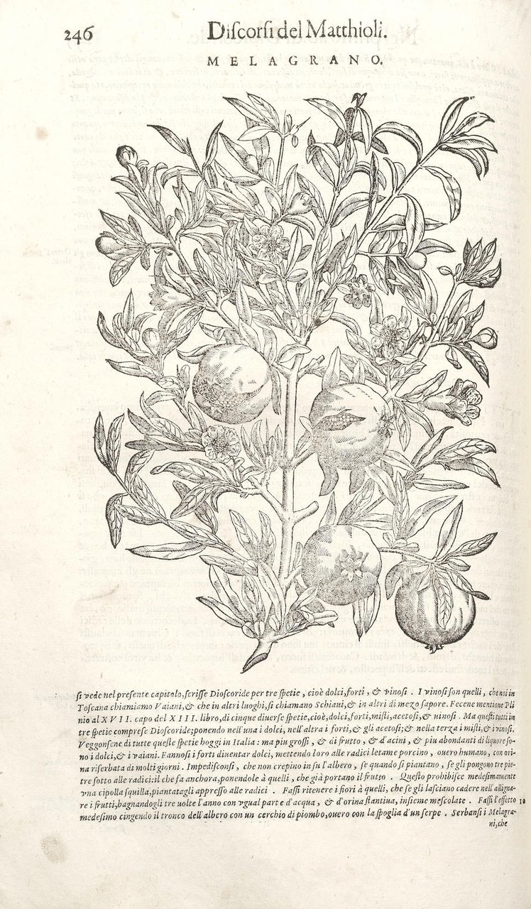 La scarsa e ricercata terza edizione in lingua italiana del 'grande Mattioli', con la serie completa di magnifiche grandi xilografie. Mattioli era un medico senese e un eminente paleologo che traducendo Dioscoride aggiunse un vasto commento insieme a centinaia di nuove piante medicinali. I grandi legni apparvero per la prima volta nel 1562 per un’edizione in ceco, nel 1563 per l’edizione in tedesco mentre Valgrisi le inserisce nella sua edizione del 1565, gli stessi usati per questA edizione del 1604. Di grande bellezza e virtuosismo tecnico, le xilografie di Liberale e Meyerpeck non mirano tanto all'accuratezza dell'illustrazione botanica, quanto alla trasformazione della natura in opera d'arte. Così, i Commentarii di Mattioli, oltre a imporsi come il libro di testo obbligatorio nelle facoltà di medicina di tutta Europa, diventano anche un ricercato oggetto da collezione. Nell’arco della vita dell’autore ne furono vendute 32'000 copie. (Ilaria Andreoli ne scrive divinamente)