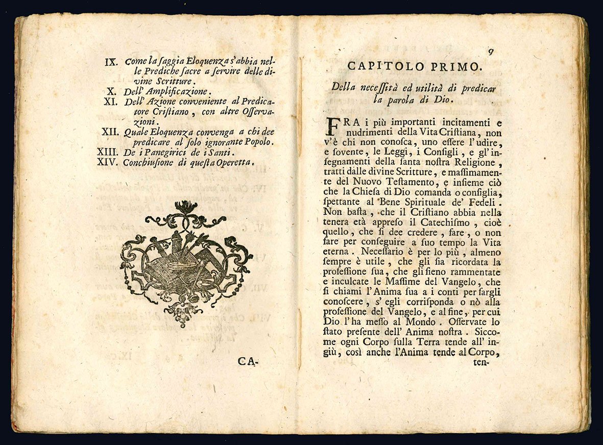 PRIMA EDIZIONE di questo trattato del Muratori, nel quale si presenta l'importanza della retorica al servizio della predicazione religiosa.