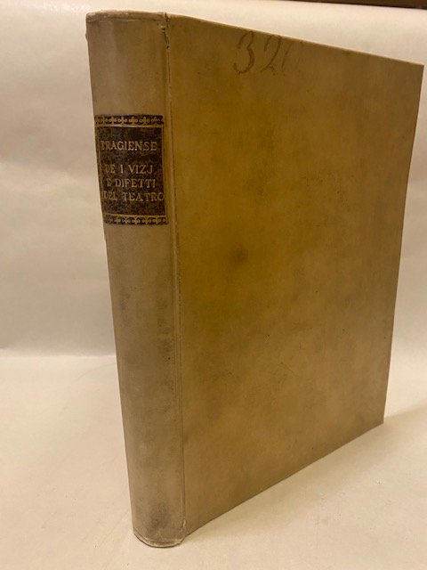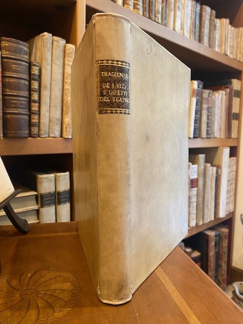 Solida legatura coeva in piena pergamena coeva con tassello al dorso. Tagli colorati, buonissime condizioni salvo qualche leggera brunitura in alcune pagine. Edizione originale e unica di quest'importante opera settecentesca sul teatro. Frontespizio in rosso e nero con vignetta allegorica incisa al centro. Numerosi capilett. figurati, testatine e finalini incisi. 7 tavv f.t. incise in rame di cui una più volte ripieg. Pianta del teatro romano, pianta del teatro greco, prospetto e scena del teatro romano. Pietro Torelli sculp. Le altre 4 tavole incise da Gio Batta Girardenghi raffigurano bassorilievi in marmo, Corniola, Orfeo e le Baccanti, Mercurio e Diana , strumenti musicali. Sc. D.