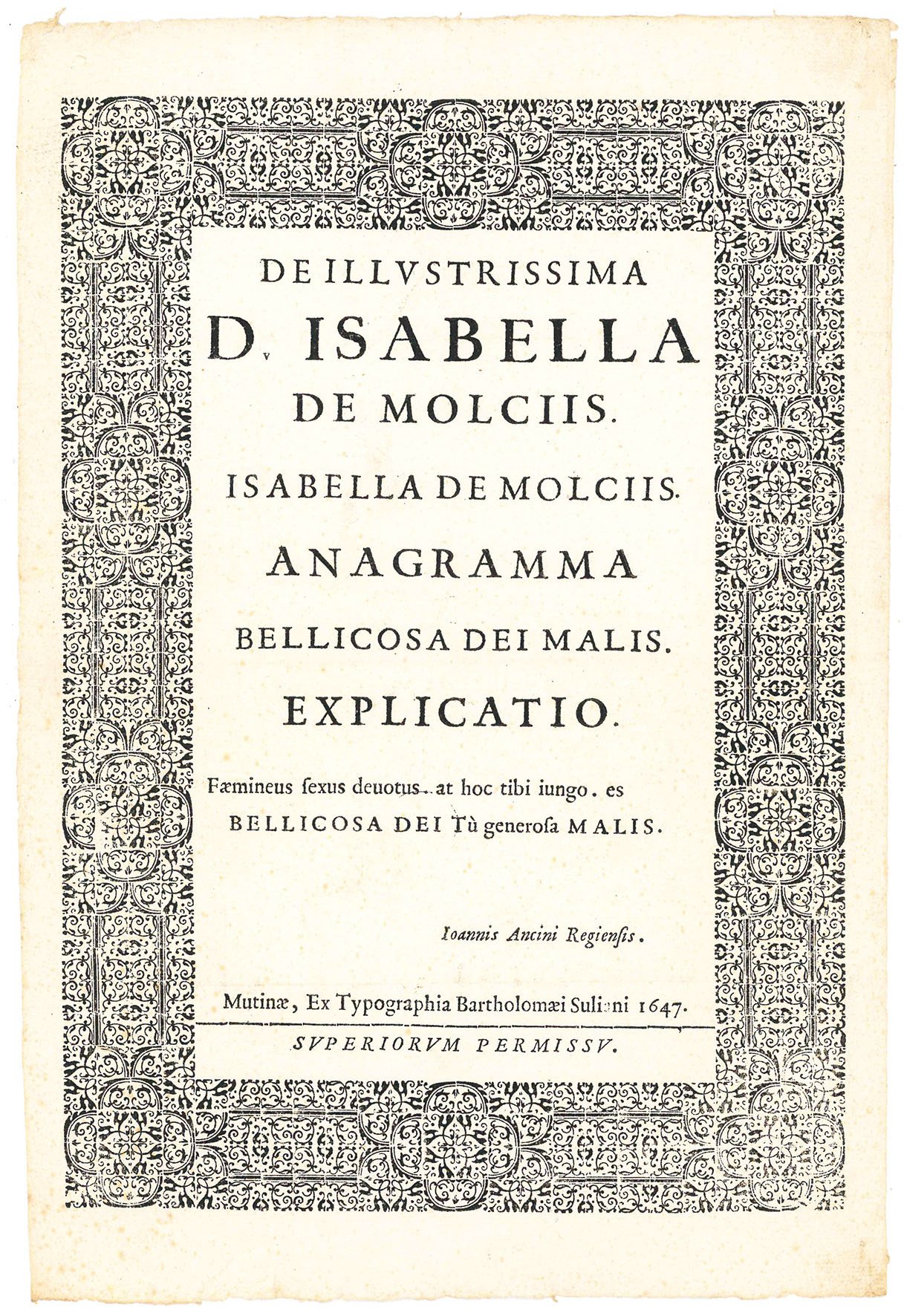 Foglio volante stampato solo al recto (mm. 317x215) entro una elaborata cornice xilografica. Ottimamente conservato. Il testo, firmato da un certo Ioannis Ancini Regiensis, prosegue: "Isabella de Molciis. Anagramma Bellicosa Dei Malis. Explicatio. Faemineus sexus devotus at hoc tibi iungi es Bellicosa Dei Tu generosa Malis". Si tratta evidentemente di un gioco di parole con il nome latinizzato di Isabella Molza, che evidentemente si distingueva per il suo zelo nel fronteggiare i mali. Manca alla bibliografia di E. Milano. Soliani cominciò a stampare nel 1646; siamo quindi ai primissimi anni della sua attività.