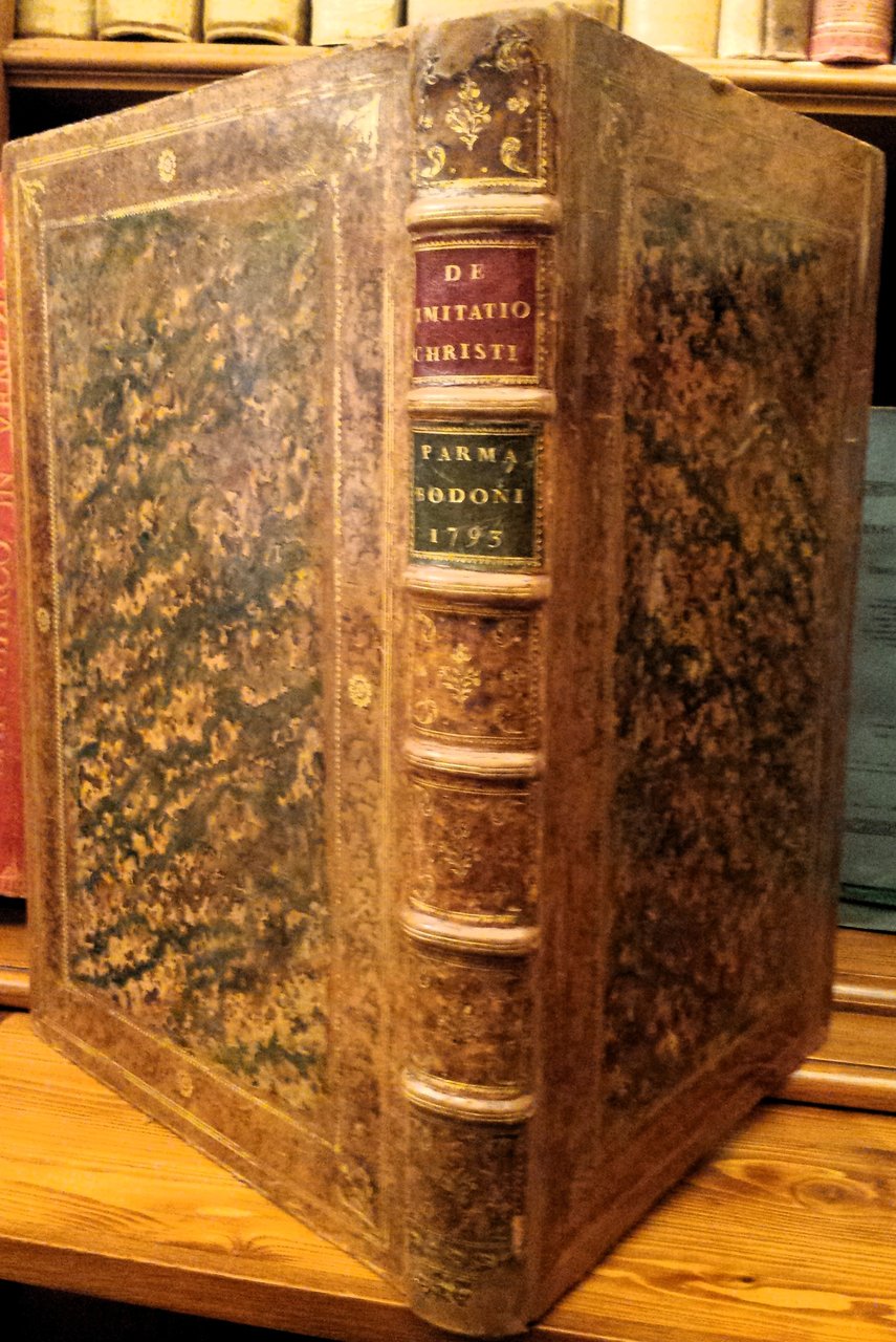 In-folio (42 cm) VII (1) 311 (1).Bella edizione in pieno marocchino, ai piatti dentro cornice un inserto in pelle marmorizzato, dorso a sei nervi con fregi dorati, tasselli al dorso con caratteri dorati. Tagli dorati e unghiatura decorata. Lettera dedicatoria di Bodoni a Ludovico I di Borbone. UNA DELLE 15 COPIE STAMPATE SU CARTA D'ANNONAY. Riferimenti: Brooks, n. 484 ; De Lama, v. 2, p. 80-81; De Gregory, Della imitazione di Gesu Cristo ., Firenze, Le Monnier, 1855, p.460 n. 510 ; A. De Backer, Essai bibliographique sur le livre de imitatione Christi, Liegi, 1864, n 427."Vita del cavaliere Giambattista Bodoni tipografo italiano e catalogo cronologico delle sue edizioni". La "Imitazione Christi" rimane, dopo la Bibbia, il testo religioso più diffuso di tutta la letteratura cristiana occidentale, e rimane un testo fondamentale per cattolici, protestanti ed ortodossi. Il testo, in lingua latina, venne redatto in epoca medievale, probabilmente in fasi successive. L'ambito della sua genesi è certamente monastico, probabilmente agostiniano o benedettino. Ne è sconosciuto l'autore, ma in genere l'opera è attribuita all'olandese Tommaso da Kempis (1380-1471), sebbene sia fortemente sostenuta anche la attribuzione a Jean Gerson, cancelliere della Sorbona. L'opera ha per oggetto la via da percorrere per raggiungere la perfezione ascetica, seguendo le orme di Gesù, e si svolge in quattro libri piuttosto differenti nei contenuti. (EN) In-folio (42 cm) VII (1) 311 (1).Beautiful edition in full morocco, on the plates inside the frame a marbled leather insert, spine with six bands with golden friezes, plugs on the spine with golden characters. Golden cuts and decorated nails. Dedication letter from Bodoni to Louis I of Bourbon. One of the rare 15 copies printed on Annonay paper. References: Brooks, n. 484 ; De Lama, see 2, p. 80-81; De Gregory, On the imitation of Jesus Christ ., Florence, Le Monnier, 1855, p.460 n. 510 ; A. De Backer, Essai bibliographique sur le livre de imitatione Christi, Liège, 1864, n 427. "Life of the knight Giambattista Bodoni, Italian typographer and chronological catalog of his editions". The "Imitation Christi" remains, after the Bible, the most widespread religious text in all Western Christian literature, and remains a fundamental text for Catholics, Protestants and Orthodox. The text, in Latin, was written in medieval times, probably in subsequent phases. The context of its genesis is certainly monastic, probably Augustinian or Benedictine. The author is unknown, but the work is generally attributed to the Dutchman Tommaso da Kempis (1380-1471), although the attribution to Jean Gerson, chancellor of the Sorbonne, is also strongly supported. The work has as its object the path to follow to reach ascetic perfection, following in the footsteps of Jesus, and takes place in four books which are quite different in content.