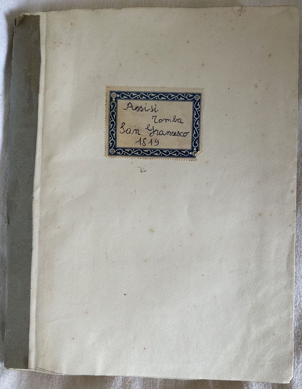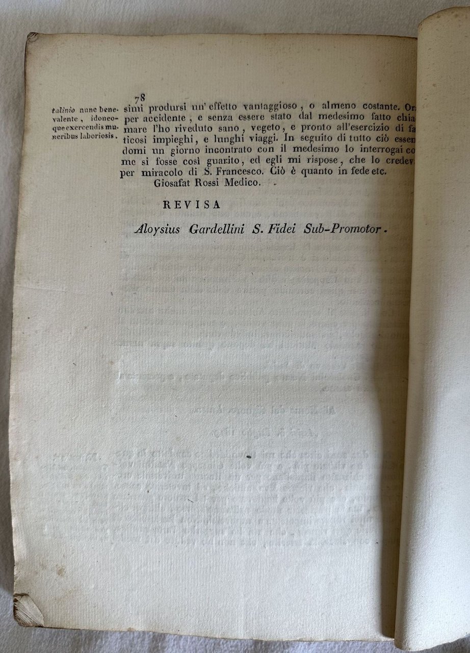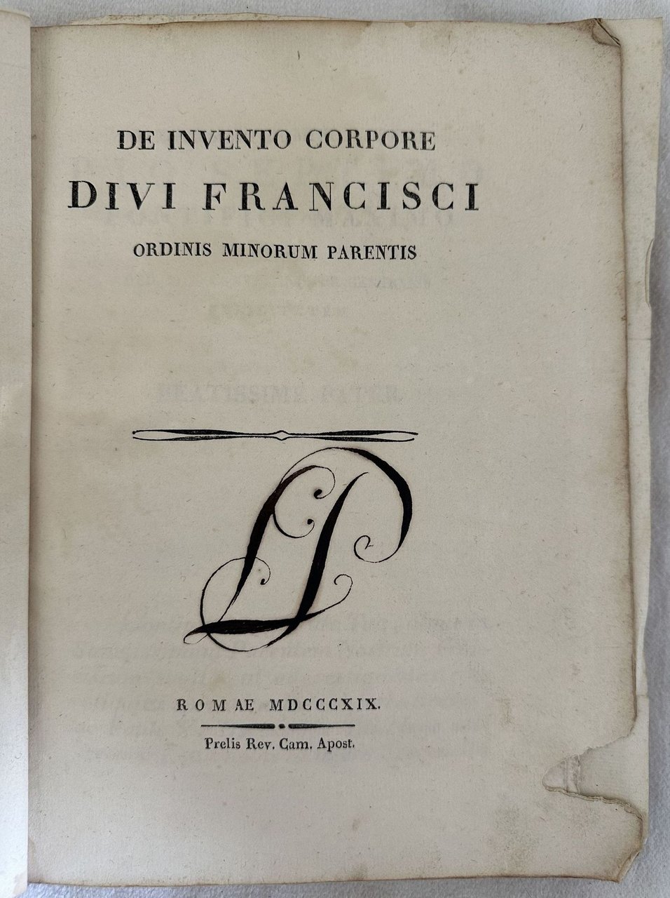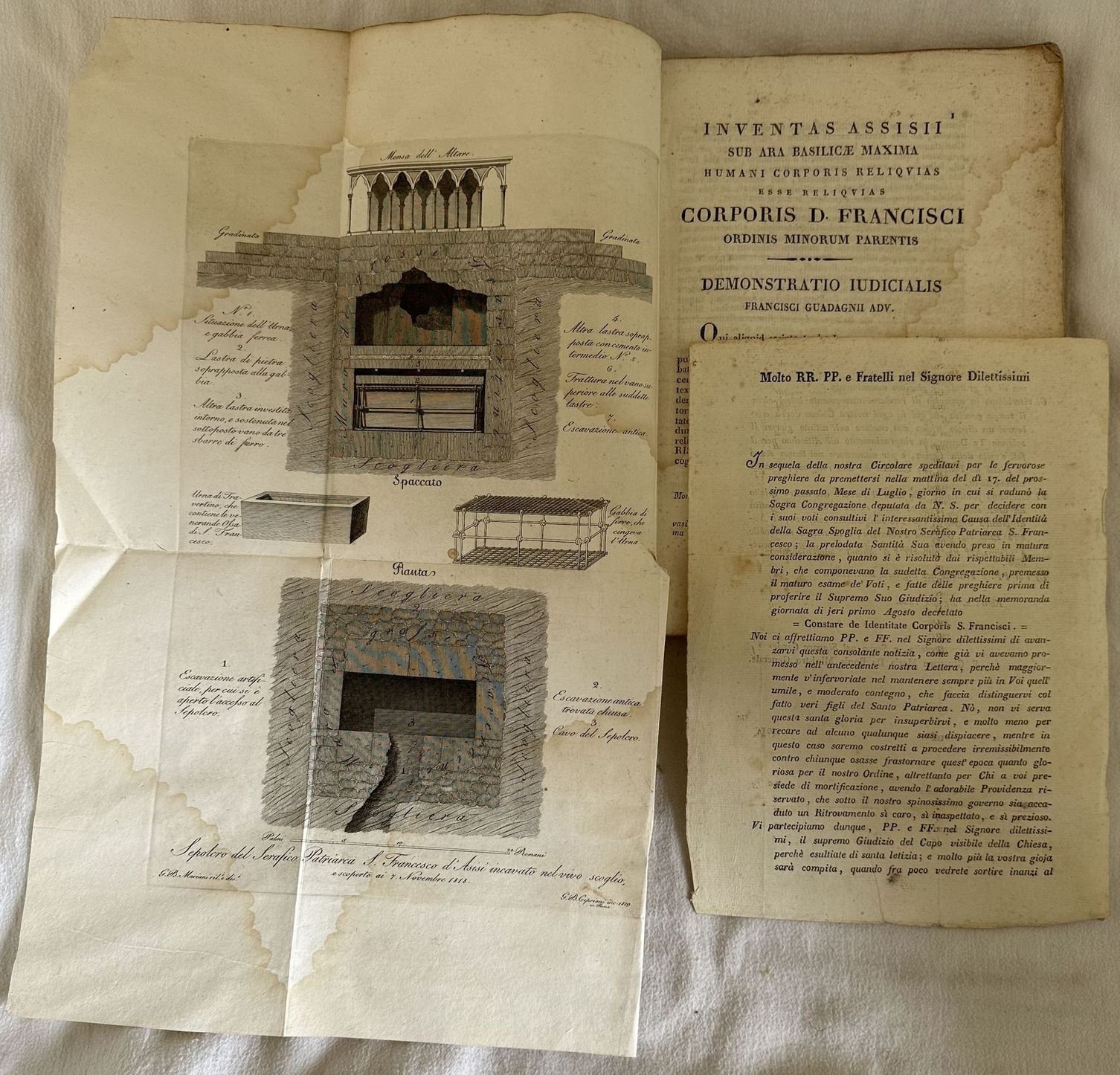 Interessante opera del 1819, la documentazione completa del ritrovamento di un corpo sotto l'altare maggiore della basilica del Santo in Assisi, avvenuto il 7 novembre 1818, e del processo per l'identificazione di questo corpo nelle spoglie di S.Francesco. Nella seconda parte la Appendix documentorum, costituita da testimonianze, tutte in italiano, degli operai che praticarono lo scavo nello "scoglio", scoprendo sotto una grata di ferro il corpo, seguite da quelle dei medici, chirurghi e periti fisico-chimici, dei muratori, "periti ferrari" e architetti, per definire il tipo di materiali usati etc. Le testimonianze sono precedute dalla riproduzione di 78 documenti con brevi e bolle pontificie (la prima e' quella di Gregorio IX per la costruzione della basilica di Assisi del 29 apr.1228) e antiche testimonianze sulla traslazione del corpo di San Francesco etc. [Lozzi 233]. Tavola ripiegata più volte incisa da G. B. Cipriani su disegno di G. B. Mariani mostra l'altare con il luogo del ritrovamento. Insieme al volume una rarissima circolare di F. Giuseppe Maria de Bonis Ministro Generale datata Roma 2 agosto 1820 nella quale si annunciava la conferma del riconoscimento delle spoglie di San Francesco. Viene annunciato nel documento che a breve avrebbero stabilito una data per l'annuncio ufficiale che sarebbe poi avvenuto il 5 settembre 1820 con l'annuncio di Papa Pio VII. In buone condizioni. Copertina morbida moderna con dorso rinforzato con titolo manoscrito su etichetta al piatto anteriore in buone condizioni con lievi usure marginali. Legatura in buone condizioni. Pagine in buone condizioni generali con fioriture e lievi gore d'umidità marginali. Piccoli Interesting work of 1819, the complete document of finding of a body under the major altar of the Basilica of the Saint in Assisi, happened the 7th of november 1818, and the trial for the identification of this boby in the man of S. Francesco. In the second part the Appendix documentorum, constituted by testimonies in italian languages of the workers who found the body, physician, surgeons and architects to definite the type of materials used etc. The testimonies are precedeed by the reproduction of 78 documents with briefs and bolle (the first one is that of Gregorio IX for the construction of the basilica of Assisi of 29 apr.1228) and antique testimoies about the traslation of the body of Saint Francesco etc. [Lozzi 233]. Folded plate engraved by G. B. Cipriani after G. B. Mariani showing the altar with the place of finding. Together with the volume a very scarce circolare of F. Giuseppe Maria de Bonis Ministro Generale dated Rome 2nd of august 1820 with the announciation of the confirm of acknowledgement of the body of San Francesco. In the document there is the decision of a brief announcement to confirm the real identity of the body of Saint Francis. This announcement wold be made the 5th of september 1820 by the Pope Pio VII. In good conditions Soft cover with reinforced spine and handwritten tiitle in the label of front plate in good conditions lightly worn in the extremities. Binding in good conditons. Pages in good conditions with foxing and light dump stains in the extremities. Little missing parts in the first 6 pages with no loss of text. In 4. Dim. 28x22 cm. Pp. (4)+99+(1)+78.parti mancanti alle prime 6 pagine senza perdita di testo. In 4. Dim. 28x22 cm. Pp. (4)+99+(1)+78.