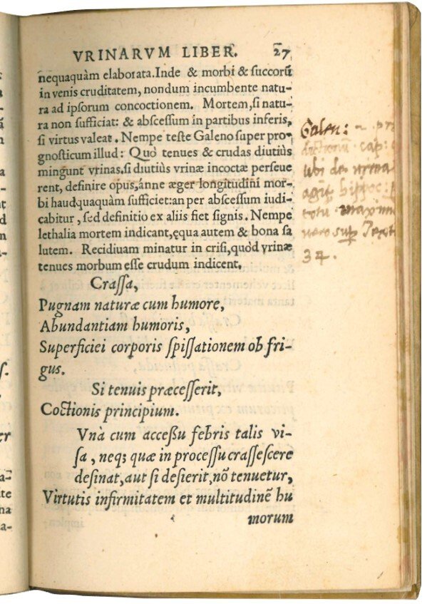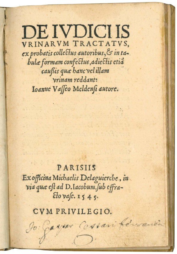 Rare edition of this collection of medical opinions and observations on urine, gathered from the works of several authoritative authors, first published in Venice in 1542 by Venturino Roffinelli. According to Renaissance medicine, which was based on Latin sources, such as Pliny's Natural History, and Ancient Greek sources, especially Aristotle, Hippocrates and Galen, the human faculties originated mainly from three organs: brain, heart and liver. The proper or bad functioning of these organs was correctly believed to determine either illness or health. The brain regulates memory and thinking, the heart keeps our blood moving, the liver shows its health condition through urine, according to the writer. This book lists and classifies different types of urine according to their colour, odour, grade of fluidity, temperature and so on, prescribing remedies. Such features were considered to give indications on the state of the four humours in the human body, whose balance was held to be crucial to good health. Jean Vassé, the author of this short treatise, was dean of the faculty of medicine at the College de France and professor at the University of Salamanca. He was one of the earliest translators of Galen from the Greek.