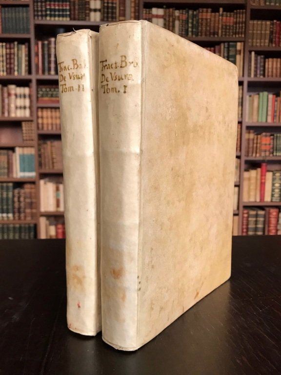 <span style="font-style: normal;">2 volumi in-4° (cm. 24), legature coeve in piena pergamena con titolo ms. ai dorsi, tagli marmorizzati; pp. XLVI [2b] 324, 291 in ottimo stato, fresche e con testo su due colonne. Edizione originale dell'opera del gesuita Ballerini circa l'usura, «</span>lo sforzo più completo di organizzare sistematicamente una materia vastissima che fosse stato compiuto in Italia sino ad allora».<span style="font-style: normal;"> In questa disputa veneta sulla liceità di certi interessi si collocano sia la maffeiana </span><i>Dell'impiego del danaro</i> (Verona 1744), sia la presente opera «vera e propria summa della questione sull'usura con un'esplorazione di materiale vastissimo» [O. Capitani, DBI V]. Ottimo esemplare. (SE3)