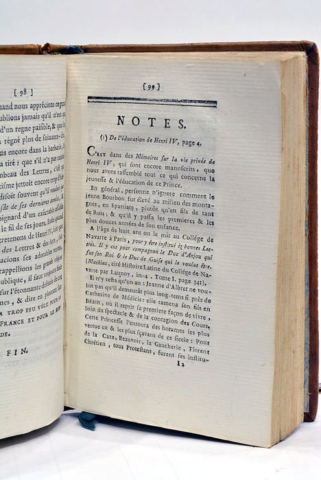 2 feuillets. 243 pages. 1 feuillet. (13x8,5 Cm). Pleine basane mouchetée. Dos lisse orné. Coins et coiffes émoussés. Dos frotté. L’auteur récuse dans cet ouvrage l’idée selon laquelle Henri IV n’aimait pas les Lettres ni les savants, et il y trace le portrait d’un souverain protecteur des Arts et des Sciences. Petite réparation ancienne dans la marge du fond des deux premiers feuillets. Tampon et auteur manuscrit sur la page de titre. Rares taches et traces de plis.