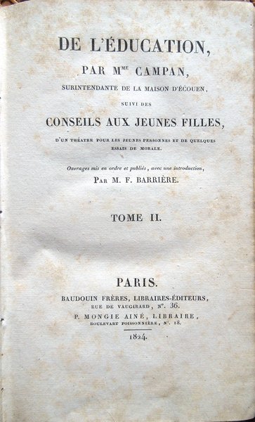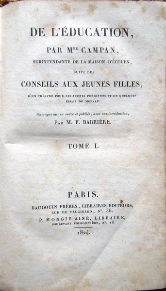 De l'éducation, par Mme Campan . suivi des Conseils aux jeunes filles, d'un théatre pour les jeunes personnes et de quelques essais de morale. Ouvrages mis en ordre et publiés, avec une introduction, par M. F. Barrière. Tome I [-II]