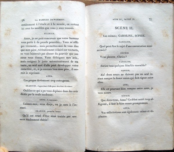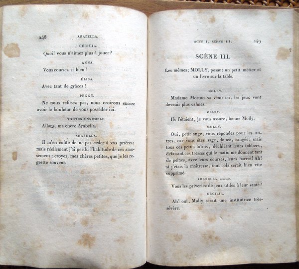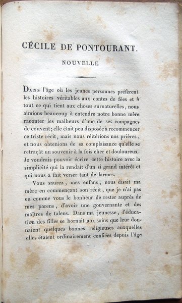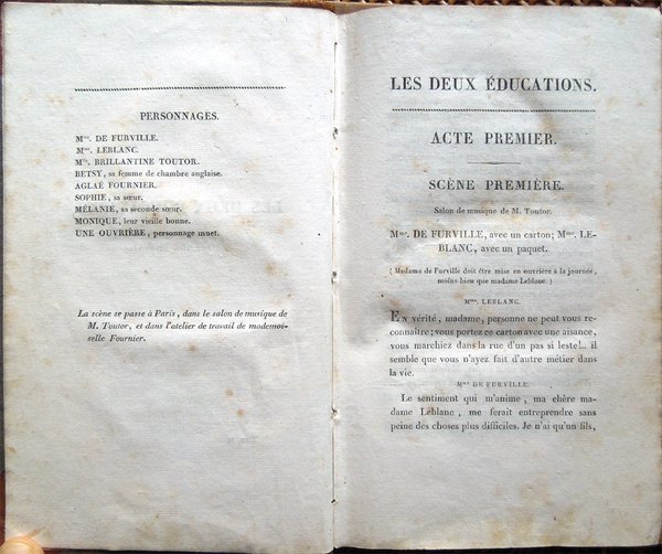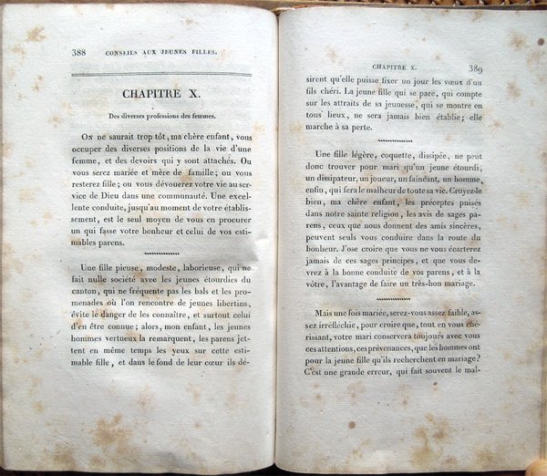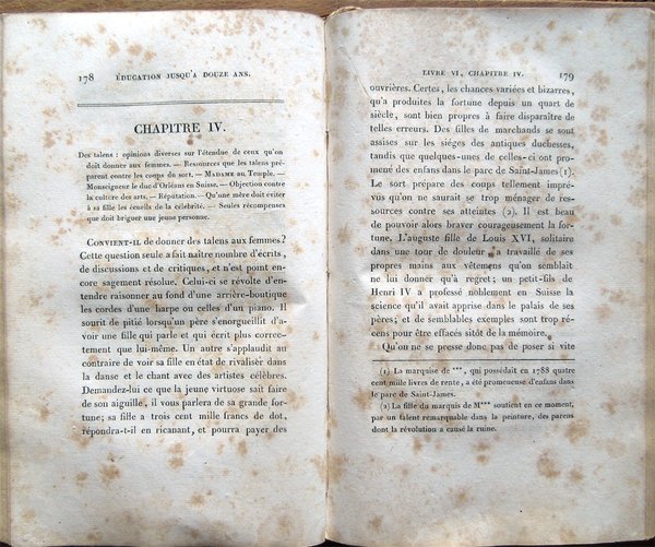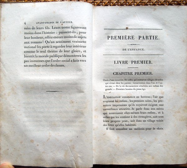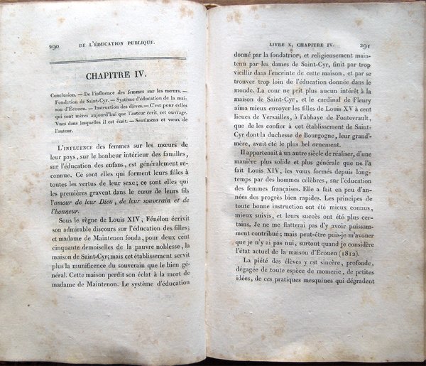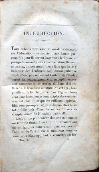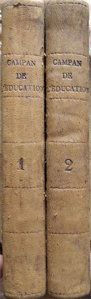 Due volumi in-8° (20,5 x 12,4 cm), pp. (4), XL, 426; (4), 453, (1), legatura coeva in mezza pelle e angoli, con titoli al dorso. Qualche normale segno del tempo alla legatura. Nella parte superiore del recto della carta di guardia anteriore di entrambi i volumi, targhetta in carta celeste applicata, recante sigle di possesso, quella al primo volume, muta, quella al secondo. Un piccolo strappo, senza perdite, lontano dal testo, perfettamente rimarginato con carta giapponese, nel margine inferiore dei fogli con le pagine 3-4 del primo volume e 81-82, 109-110, 187-188, 259-260 del secondo e nella parte superiore del margine esterno del foglio con le pagine 417-418 del secondo volume. Foxing ad alcune pagine, per il resto, esemplare ben conservato. Table générale: Tome Premier. Introduction. Avant-propos de l'auteur. Première partie - Livre premier Chapitre Ier. Choix d'une nourrice. Chapitre II. Des mères qui nourissent leurs enfans. Chapitre III. Des berceuses. Chapitre IV. Premiers soins donnés à l'enfance. Chapitre V. De la nourriture des enfans. Chapitre VI. De la peur. Livre II Chapitre Ier. Nécessité d'un plan d'éducation. Chapitre II. Age auquel commence l'éducation. Chapitre III. Des moyens d'éducation. Chapitre IV. De la colère: moyens d'en prévenir ou d'en calmer les accès. Livre III Chapitre Ier. De la mémoire des enfans avant l'âge de trois ans. Chapitre II. De la conduite des enfans envers les domestiques. Chapitre III. Des jouets d'enfans. Chapitre IV. Vêtement qui sied aux jeunes filles. Livre IV Chapitre Ier. Premières leçons de lecture. Chapitre II. Premières leçons d'écriture. Deuxième partie - Livre V Chapitre Ier. Influence de l'exemple donné par une mère à ses filles. Chapitre II. Des mères gouvernantes. Livre VI Chapitre Ier. Étude de l'histoire sainte. Chapitre II. Lectures a haute voix. Chapitre III. Ouvrages à l'aiguille. Chapitre IV. Des talens. Chapitre V. De la danse. Troisième partie - livre VII Chapitre Ier. Choix d'un confesseur. Chapitre II. Passage de douze à seize ans. Chapitre III. A quel âge on pourrait lire aux jeunes personnes des ouvrages propres à leur faire connaître de grandes erreurs et de grandes infortunes. QUATRIÈME PARTIE - Livre VIII Chapitre Ier. Réflexions générales. Chapitre II. De la nourriture des élèves. Chapitre III. Des soins qu'une maîtresse de pension doit remplir. Chapitre IV. Du linge des élèves. Chapitre V. Exercices de piété. Livre IX Chapitre Ier. De l'émulation. Chapitre II. Les qualités du cœur méritent des récompenses aussi-bien que l'étude et les talens. Chapitre III. Pénitence de la maison d'Écouen. Chapitre IV. Jeux et divertissemens. Livre X Chapitre Ier. Idées générales sur l'enseignement. Chapitre II. Soins confiés aux jeunes personnes. Chapitre III. Récapitulation sommaire. Chapitre IV. Conclusion. Conseils aux jeunes filles. Avant-propos de l'auteur. Chapitre Ier. Sur l'amour, le respect, l'obéissance et la reconnaissance que l'on doit à Dieu et à ses parens. Chapitre II. Sur la paresse. Chapitre III. Sur le respect dû aux propriétés. Chapitre IV. Histoire de Cartouche. Chapitre V. Sur la calomnie. Chapitre VI. Sur le mensonge. Chapitre VII. Sur les avantages de l'amour du travail. Histoire d'Henriette et d'Edmond. Chapitre VIII. La fortune ne peut être égale entre les hommes. La Ferme partagée. Chapitre IX. Modération dans les désirs, constance dans les revers. Le petit Auvergnat Chapitre X. Des diverses professions des femmes. Chapitre XI. Pour le jeunes filles qui se mettent en service. Chapitre XII. Des divers genres de services, et des obligations qu'ils imposent. Chapitre XIII. Effets différens de la bonne ou de la mauvaise conduite. La Vieille de la cabane. Tome second. Théatre. Les Deux éducations. La famille Dawenport. Cécilia. Le Perroquet. La Vieille de la cabane. Arabella. La nouvelle Lucile. Essais de morale. Aux jeunes filles. Essais de morale. Du besoin de plaire et du désir d'être heureuse. Politesse, usage du monde. Devoirs et qualités d'une gouvernante. Nouvelle. Cécile de Pontourant. Titolo completo: De l'éducation, par Mme Campan, Surintendante de la maison d'Écouen, suivi des Conseils aux jeunes filles, d'un théatre pour les jeunes personnes et de quelques essais de morale. Ouvrages mis en ordre et publiés, avec une introduction, par M. F. Barrière. Tome I [-II]. Editori: Baudouin Frères, Libraires-Éditeurs - P. Mongie Ainé, Libraire.