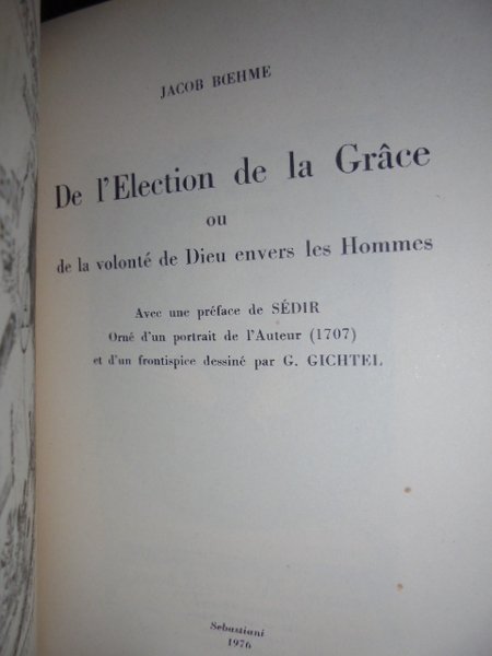 Böhme, Jacob. Milano, (Sebastiani) Archè, 1976. De L’Election De La Grâce ou la volonté de Dieu envers les Hommes. In-8°, cart. edit. avec une préface de Sédir, orné d’un portrait de l’Auteur (1707) et une frontispice dessiné par G. Gichtel pp. XII-246, ill. b/n. Le mot grâce se rencontre dans le Nouveau Testament sous deux acceptions principales: caractéristique de l’œuvre accomplie par le Christ (dans ce sens la grâce est opposée à la loi mosaïque) et surtout bienveillance de Dieu à l’égard des hommes, laquelle se manifeste par un don gratuit. Come nuovo. Neg. mass.