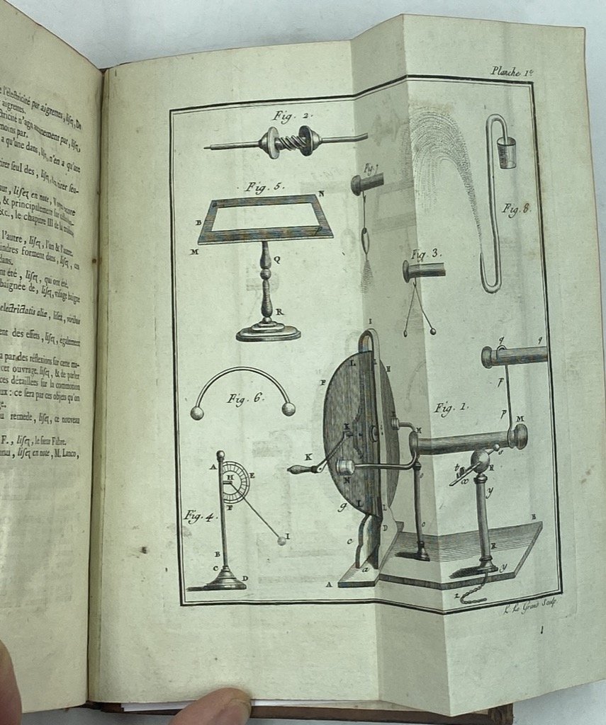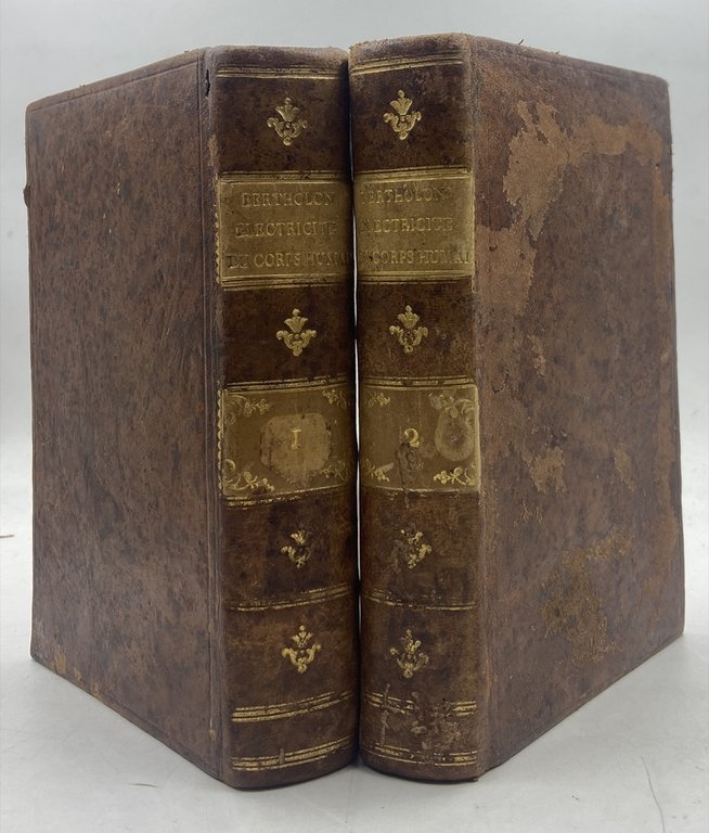 Due volumi in ottavo, legatura coeva in tutta pelle spugnata, cornici a secco sui piatti, fregi e filetti dorati sul dorso e titoli su tasselli nocciola, tagli rossi, cm 21 x 13.5, pp (4) XXXIV II 522 (4), (4) IV 510 (2), 6 tavole ripiegate in calce al secondo tomo. Lievi sbucciature sulla coperta, minuto timbretto col cognome di un antico proprietario su occhietti e frontespizi. Buon esemplare, completo di tutte le tavole, delle carte di errata e del Privilege du Roi. Seconda edizione, notevolmente ampliata, delle ricerche dell’Abate Bertholon sull’elettricità, il suo effetto sul corpo umano e il suo utilizzo terapeutico; l’opera fu inizialmente presentata dall’autore in risposta al quesito sul rapporto tra malattie e quantità di «fluido elettrico« nel corpo proposto dall’Académie de Lyon nel 1777. Il lavoro di Bertholon fu premiato nel 1779 e pubblicato nel 1780 (a Lione da Bernuset e a Parigi da Didot) in un unico volume in dodicesimo di 540 pagine, privo di figure. L’abate sposava la tesi della presenza nel corpo di un fluido elettrico naturale soggetto, attraverso i pori e la respirazione, a scambi con l'atmosfera caricata positivamente o negativamente che provocano eccessi o difetti di «elettricità animale» e, se lo scompenso persiste, conseguenti disturbi e malanni (spasmi, malattie nervose e mentali, febbri, infiammazioni) trattabili con l'esposizione a moderate correnti elettriche volte a ristabilire l'equilibrio fisiologico. La seconda edizione, pressoché raddoppiata e con un corredo di 6 tavole incise illustranti diversi apparecchi ed esperimenti, apparve dopo la pubblicazione degli studi di Bertholon sugli effetti dell’elettricità sui vegetali (1783) e rende conto delle più recenti ricerche sul galvanismo e della ricezione dell’opera presso la comunità scientifica dell’epoca. La prima parte del trattato è dedicata all’elettricità nel corpo umano e degli animali in salute; la seconda presenta una classificazione dei malanni e una sezione, enormemente accresciuta rispetto alla prima edizione, dedicata ai «metodi di elettrificazione», con la descrizione di macchine ed esperimenti dell’autore e vari scienziati europei (de Guericke, Dufay, Nairne, Girardini, Musnier); la terza e conclusiva sezione prende in esame l’utilizzo dell’elettricità nel trattamento dell’odontalgia e della cecità, e l’influenza dell’elettricità atmosferica sulle malattie psichiatriche, sul ciclo mestruale, sulle nascite e le morti. Wellcome II, p. 154; Weaver, Catalogue of the Wheeler Gift I, p. 234, n. 533 («there is much about atmospheric electricity and its effects on the human system; also applications of positive and negative electricity to the cure of diseases«); Ronalds Library, p. 54; Blake, p. 44; Rowbottom / Susskind, Electricity and Medicine, 1984, p. 33: «Despite the criticism of his work by Marat and other contemporaries, Bertholon had effectively stimulated interest in the employment of negative electricity, and he had also provided an apparent explanation of the effects felt by some persons in thundery weather and during changes of the weather, matters that are not fully understood even now. His views on the electrical cause of disease had a certain influence on Galvani».