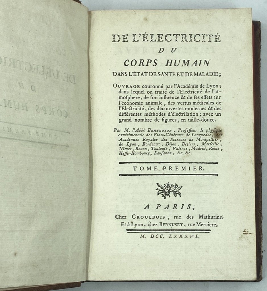 DE L'ÉLECTRICITÉ DU CORPS HUMAIN DANS L'ÉTAT DE SANTÉ ET DE MALADIE; ouvrage couronne par l'Académie de Lyon; dans lequel on traite de l'Électricité de l'atmosphere, de son influence & de ses effets sur l'économie animale, des vertus médicales de l'Électricité, des découvertes modernes & des différentes méthodes d'électrisation; avec un grand nombre de figures, en taille-douce. Par M. l'abbe Bertholon […]- TOME PREMIER (-SECOND). A PARIS, Chez CROULBOIS (…) Et à Lyon, Chez BERNUSET (…). M. DCC. LXXXVI.