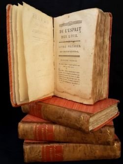 4 volumi in-12° (cm. 13,3), graziose legature coeve in m. pelle con titolo in oro su tassello ai dorsi. Si tratta della sola opera -Dello spirito delle leggi- pubblicata in realtà a Reims o Parigi come primo titolo della collana delle opere dell'autore. Esemplare molto buono. (SG5)