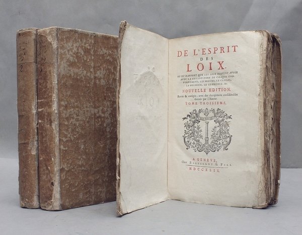 De l'Esprit des Loix. Ou du rapport que les loix doivent avoir avec la constitution de chaque gouvernement, les moeurs, le climat, la religion, le commerce, &c. Nouvelle Edition. Revue & corrig‚e, avec des changemens consid‚rables donn‚s par l'Auteur. -Ginevra, chez Barrillot & fils, 1749. (Unito):Defense de l'Esprit des Loix, a laquelle on a joint quelques eclaircissemens. - Ginevra, chez Barrillot & fils, 1750.