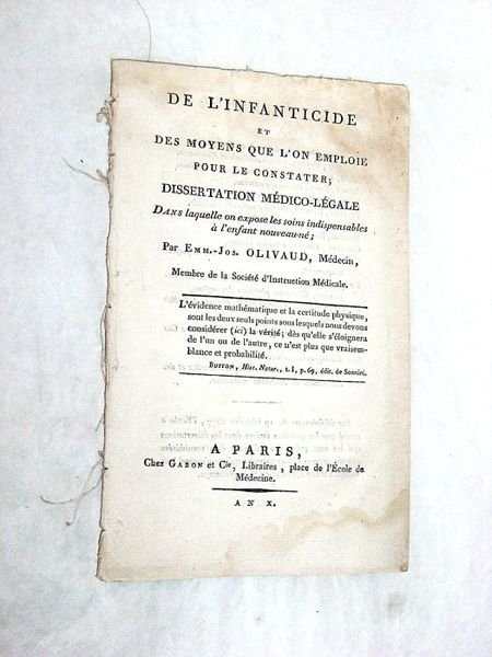 De l'Infanticide et des moyens que l'on emploie pour le constater; dissertation médico-légale dans laquelle on expose les soins indispensables à l'enfant nouveau-né.