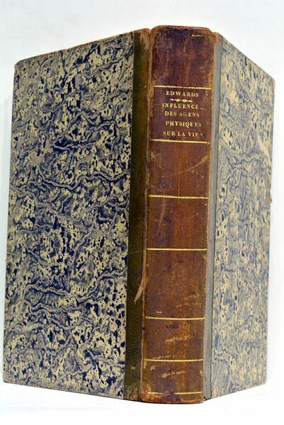 xvj. 654 pages. 1 feuillet. Manque la planche hors-texte. (21x13,5 Cm). Demi-cuir. Dos lisse orné. Coins et coiffes émoussés. Petits accrocs. C'est avec cette œuvre qu'Edwards apparaît comme un précurseur de l'écologie. L'auteur y traite de l'influence des facteurs environnementaux sur la vie animale ; il relate ainsi de très nombreuses expériences sur les effets de l'air, l'eau, la température, la lumière et l'électricité sur la vie organique. Il manque à notre exemplaire la planche dépliante gravée. Rousseurs. Exemplaire très bien conservé.