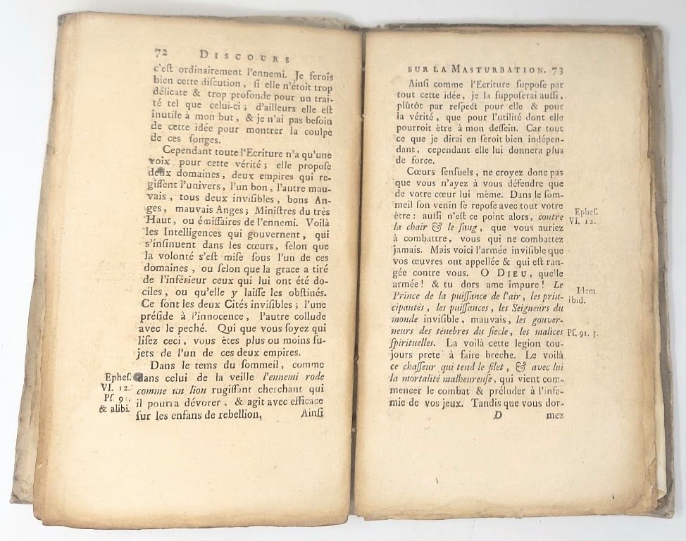 >in-12, pp. 183, legatura in cartonato d'attesa coevo, titolo ms. al dorso. Fregetti al tit., testatine e finalini. Rara prima edizione. L'autore fu mistico protestante, discepolo di Madame Guyon e Bourignon, e fondatore del Cercle lausannois des Âmes Intérieures. L'opera è un interessante esempio di letteratura medica del XVIII secolo che si concentra sul ruolo del sesso nella vita coniugale, e pertanto condanna moralmente la masturbazione. Buon esemplare, in barbe (lieve ed uniforme brunitura). Barbier I, 1022. Blake, 332.
