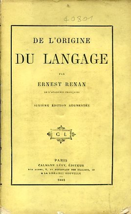 In-8°, pp. (4), 258, brossura editoriale gialla riquadrata. Dorso restaurato. Fioriture. Discreto esemplare in barbe. Sesta edizione accresciuta di questa importante opera del Renan la cui prima edizione risale al 1848 e il cui oggetto è l'indagine sia filosofica che glottologica dell'origine delle lingue, e al contempo, l'elaborazione di una vera e propria teoria della conoscenza mediata proprio da tale ricognizione linguistica.