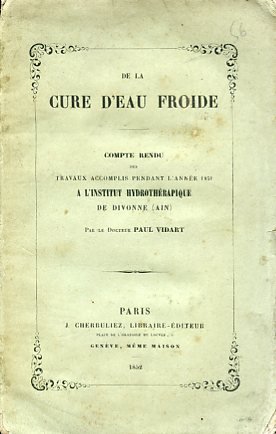 In-8°, pp. (4), 192, (1) di indice, brossura editoriale verdina con titolo entro filetto con fregi accantonati. Una bella litografia seppiata f.t. incisa da Sorrieu e impressa da Thierry di Parigi con veduta del Parc des Bains di Divonne e delle sue sorgenti. Tabelle in fine. Dorso restaurato. Fioriture normali. Buon esemplare. Edizione originale e unica, rara. Contiene un avant-propos, una lettera al dottor Roubaud ('Preissnitz est mort !'), una notizia scritta da Berthoud sull'Istituto idroterapico e le sorgenti della Divonne e un resoconto delle differenti patologie trattate a Divonne nel 1851 tramite le sue acque: reumatismi, gotta, nevralgie, nevrosi e nevropatie, erpes, scabbia, malattie respiratorie, malattie del tubo digestivo, malattie dell'apparato genitale ed urinario maschile e femminile, malattie addominali, malattie linfatiche, sifilide, paralisi, lesioni dei centri nervosi, ecc.