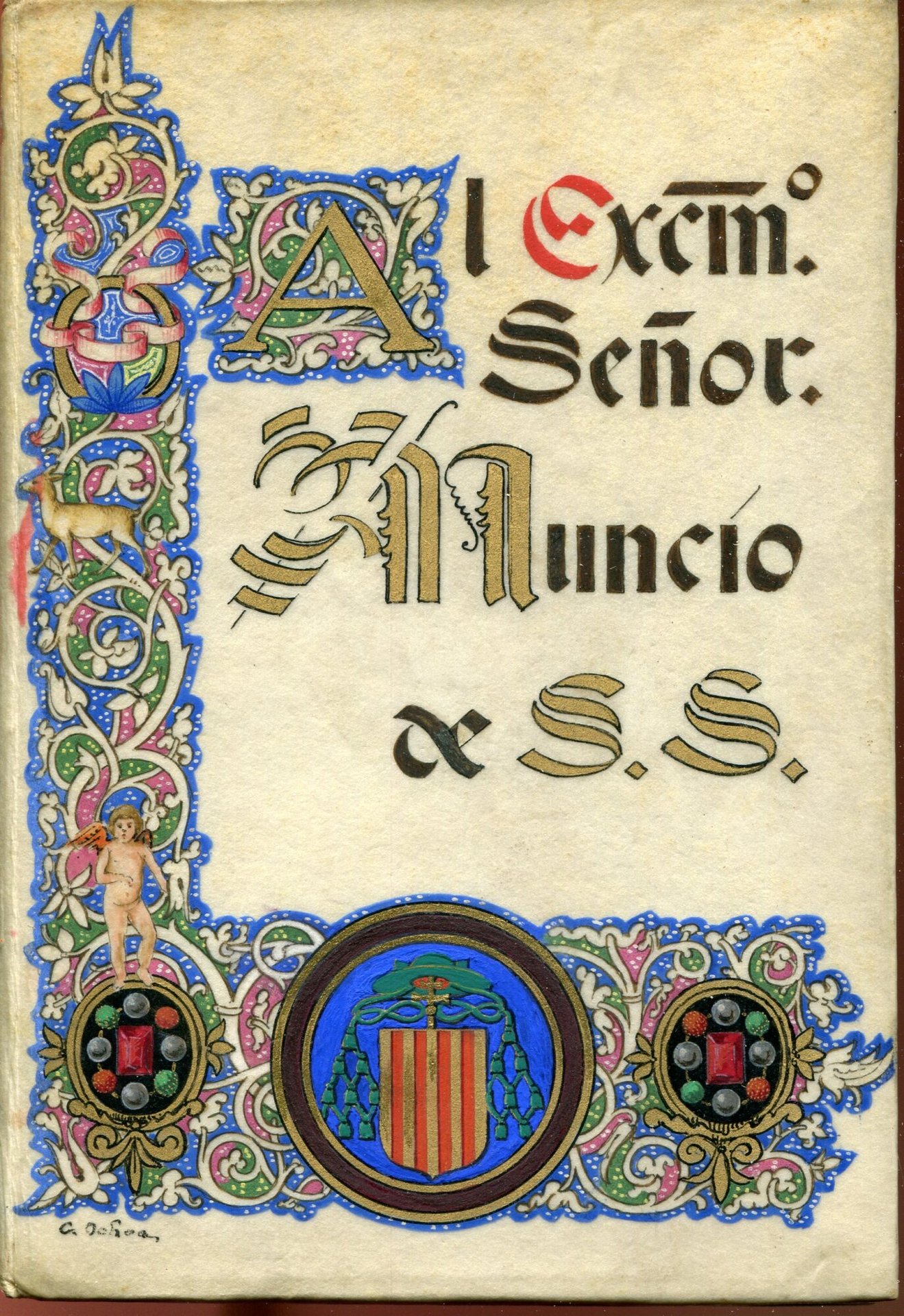 42 pagine; 19 cm., legatura in permena con titolo e ricche decorazioni al piatto anteriore, acetato di protezione ingiallito e con mancanze, guardie in seta rossa, fioriture sulle prime ed ultime carte Molto buono (Very Good) .