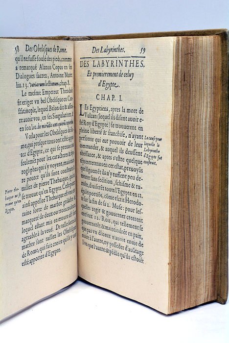 4 feuillets. 304 pages. 3 feuillets. (15,5 x 10 Cm). Pleine reliure moderne. Dos à nerfs. Petite réparation dans la marge supérieure du titre. Rousseurs. Cet ouvrage de l'historien Claude Malingre traite des réalisations extraordinaires des "anciens": pyramides d'Egypte, Colosse de Rhodes, Obélisques d'Egypte et de Rome, Théâtres et Amphithéâtres, Sépulchres et Funérailles des différents peuples y compris ceux des Indes Orientales et Occidentales, etc. Signature à l'encre de l'époque difficilement lisible.