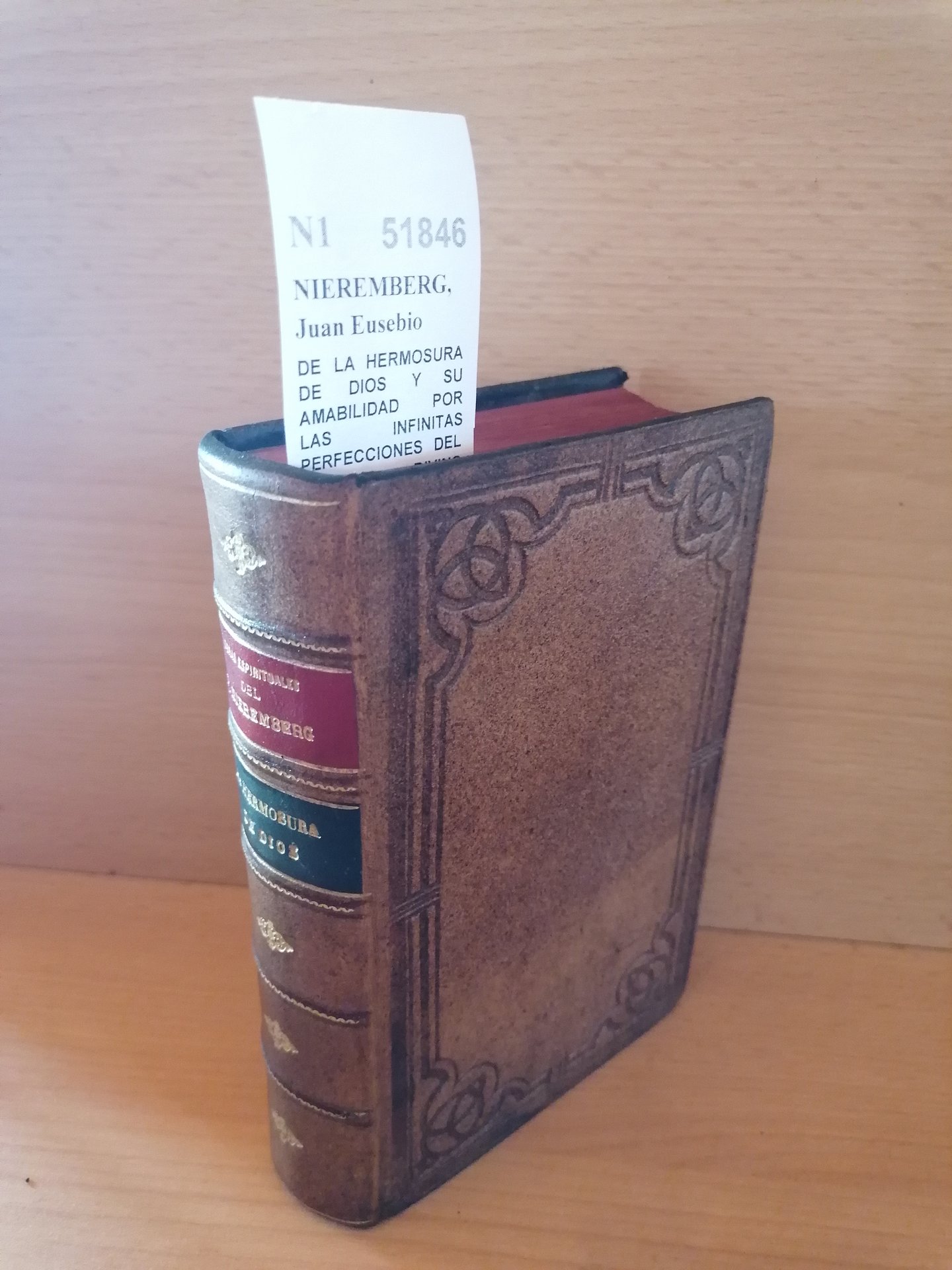 NIEREMBERG, Juan Eusebio DE LA HERMOSURA DE DIOS Y SU AMABILIDAD POR LAS INFINITAS PERFECCIONES DEL SER DIVINO compuesto por el V. P. --- Gregorio del Amo. Madrid. 1890 554 p. (17 cm) Enc. plena piel con nervios, tejuelos y dorados. Cortes coloreados. Sello de anterior propietario N1 (Ref.51846) religion teologia jesuitas eternidad
