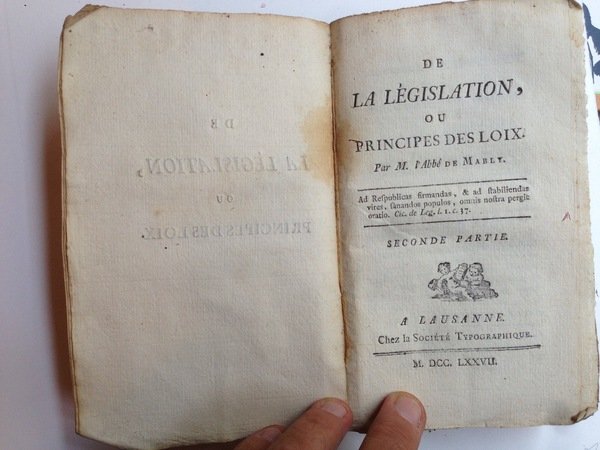 2 voll. in-12°, pp. VIII,248; IV,250, brossura editoriale d'attesa. Buon esemplare fresco, in barbe. Mably, Gabriel Bonnot de Pensatore politico francese (Grenoble 1709 - Parigi 1785). Fratello (per parte di madre) di Condillac, studiò nel seminario di Saint-Sulpice a Parigi e percorse la carriera ecclesiastica sino a divenire suddiacono; successivamente ricoprì importanti incarichi diplomatici. Caduto in disgrazia presso il suo protettore (il card. P. de Tencin, segretario di Stato agli Affari esteri), lasciò la diplomazia e si dedicò agli studi. Tra le sue opere si segnalano in particolarmente: Des droits et des devoirs du citoyen (1758); Entretiens de Phocion sur le rapport de la morale avec la politique (1763); Doutes sur l’ordre naturel des sociétés politiques (1768); De la législation ou principes des lois (1776); De l’étude de l’histoire (1783). Il pensiero di M., per più aspetti assimilabile a quello di Rousseau, ha esercitato un significativo influsso sulle correnti più radicali della Rivoluzione francese: in esso, infatti, la critica all’ancien régime (in partic. all’assolutismo regio e al potere nobiliare, ai quali M. contrappone gli antichi «diritti della nazione franca», tra i quali spicca il diritto all’insurrezione contro la tirannide) si salda con la critica all’individualismo dei moderni (che trova espressione nelle teorie economiche dei fisiocratici). Secondo M. il ‘progresso’ dei moderni – nelle lettere, nelle scienze, nelle arti e nell’industria – ha in realtà determinato la loro corruzione, perché li ha allontanati dall’eguaglianza e dall’armonia dello stato naturale. In questo processo degenerativo un ruolo di particolare importanza spetta alla proprietà, che M. considera all’origine di tutti i mali sociali: di qui la proposta di una sua graduale abolizione, da realizzarsi nel quadro di uno Stato dove domini l’eguaglianza e la legge. Ammiratore delle repubbliche antiche, M. ispira il suo Stato ideale alle teorie di Platone e alle istituzioni di Sparta, anche se tenta di ‘adattarlo’ alla realtà delle nazioni moderne accettando la forma monarchica dello Stato (una monarchia ‘repubblicana’, con un potere esecutivo regio debole) e prevedendo l’esistenza di un sistema rappresentativo (i cui membri, pur non essendo eletti a suffragio universale, sono tuttavia sottoposti a un mandato di tipo imperativo).