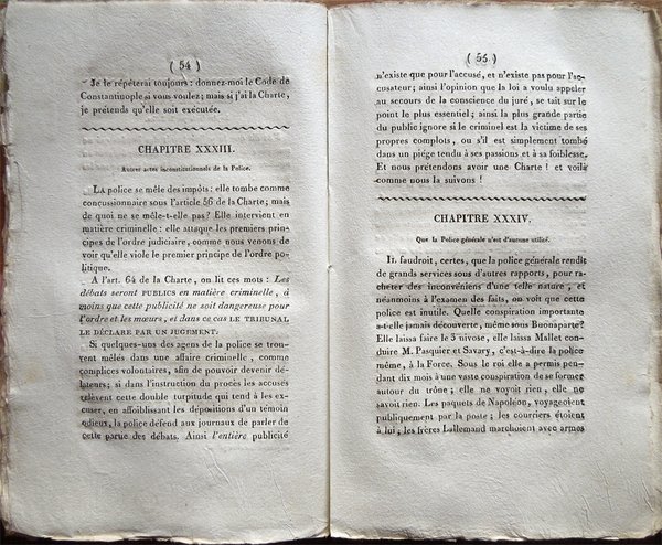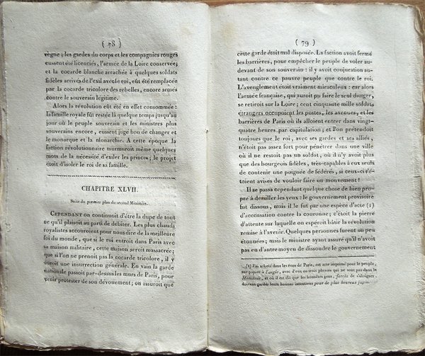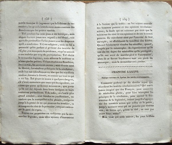 In-8° (22 x 13,5 cm), pp. 206, (2), brossura muta coeva con titoli su tassello in carta al dorso. Normali segni d'uso e del tempo alla brossura. Piccola mancanza nell'angolo inferiore esterno del foglio con al recto il frontespizio. Mancanza anche all'ultima carta bianca, pari circa ai suoi due terzi. Pochi, piccoli, lievissimi segni d'umido, per il resto, esemplare ben conservato, in barbe. Nello scritto l'autore sostiene la necessità dell'introduzione in Francia di una vera monarchia rappresentativa, in cui il monarca regni ma non governi e in cui sia garantita la libertà di stampa. François René visconte di Chateaubriand, scrittore e uomo politico francese (Saint-Malo 1768 - Parigi 1848), trascorse gli anni dell'infanzia parte a Saint-Malo, parte in collegi nelle città di Dol, Rennes, Dinan e nel severo castello di Combourg. Entrato nell'esercito, fu luogotenente nel reggimento di Navarra e assistette allo scoppio della Rivoluzione: in seguito, nel 1791, partì per l'America. Nel 1792 rientrò in Francia per combattere contro i rivoluzionari. Ferito durante l'assedio di Thionville, si rifugiò in Inghilterra dove visse per qualche anno in miseria. Le morti della madre e di una sorella, avvenute mentre egli si trovava a Londra, lo scossero profondamente e maturarono la sua conversione: al ritorno in Francia (maggio 1800), aveva con sé una prima stesura del Genio del cristianesimo, che fu poi pubblicato nel 1802. Bonaparte cercò in ogni modo di legare alla sua causa Chateaubriand: lo inviò come segretario di ambasciata a Roma, quindi lo nominò ministro di Francia nel Vallese. Ma dopo la fucilazione del duca di Enghien (1804), Chateaubriand si dimise dalla carica e si dedicò al suo lavoro di letterato, manifestando apertamente sul Mercure de France la sua opposizione all'imperatore. Nel 1811 venne eletto all'Accademia francese ma non poté pronunziare il discorso per la sua ammissione perché ritenuto sedizioso da Napoleone. Con il ritorno dei Borboni, che egli aveva auspicato nel libello intitolato Di Bonaparte e dei Borboni (1814), riprese la sua attività politica. Accompagnò Luigi XVIII durante i Cento giorni e fu ministro degli interni. L'opera De la monarchie selon la Charte (1816) gli costò la radiazione dalla lista dei ministri: privato della pensione, fu costretto a vendere la sua biblioteca. Appoggiò allora la tesi degli oltranzisti monarchici. Luigi XVIII lo nominò nel 1820 ministro di Francia a Berlino, poi ambasciatore a Londra. Ministro degli affari esteri dopo il congresso di Verona, fu uno dei promotori della guerra contro i liberali di Spagna per restaurarvi l'assolutismo monarchico. Nel 1828 fu nominato ambasciatore a Roma da Carlo X. All'avvento di Luigi Filippo, si rifiutò di servire il nuovo re e ostentò la sua fedeltà alla dinastia caduta. L'influenza di Chateaubriand fu grandissima ed egli dominò la letteratura del suo tempo, portandovi l'ispirazione e le tematiche proprie del Romanticismo: il sentimento religioso, il senso di malinconia, l'interesse per la storia, in particolar modo per il medioevo, l'amore per la natura sono elementi che si riflettono su tutta la letteratura francese dell'Ottocento.