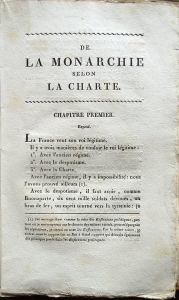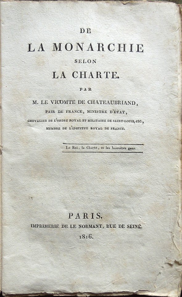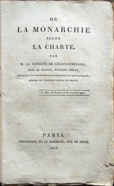 De la monarchie selon la Charte. Par M. le vicomte de Chateaubriand, Pair de France, Ministre d'État, Chevalier de l'Ordre Royal et Militaire de Saint-Louis, etc, membre de l'Institut Royal de France