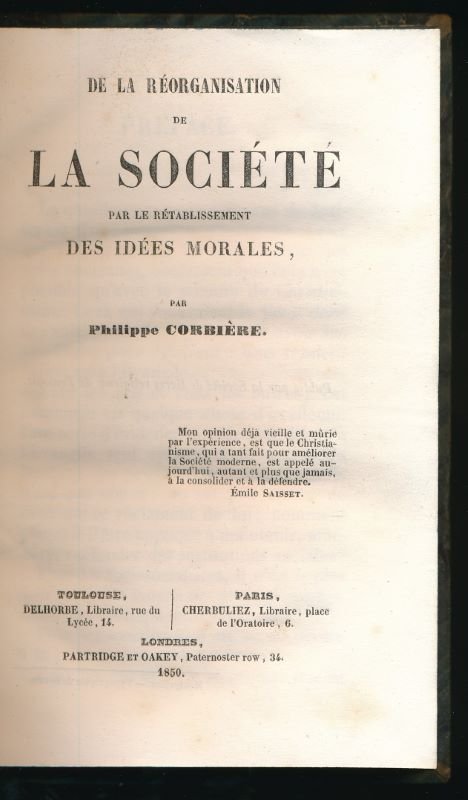 Delhorbe 1850 Toulouse, Delhorbe - Paris, Cherbuliez - Londres, Partridge et Oakey, 1850. In-8 relié demi-basane verte, dos lisse orné, VIII + 261 pages. Bon exemplaire.