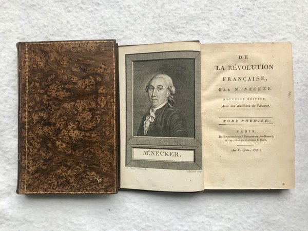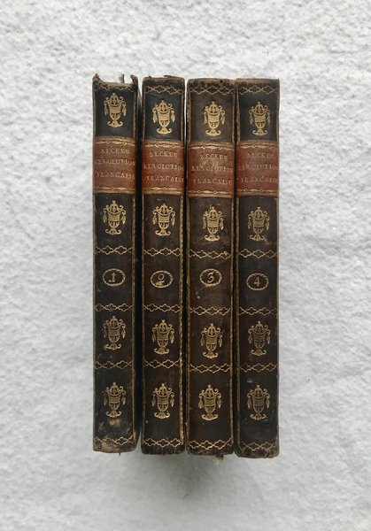 PESO 1.5 KG. NECKER, Jacques. De la Révolution française…Nouvelle édition. Avec des additions de l'Auteur. Paris, De l'Imprimerie de J. Drissonier, 1797. In-8, 4 volumi in legatura coeva in tutta pelle marmorizzata, cornici decorative dorate ai piatti, dorsi con fregi e tomaison in oro, titoli su tasselli in marocchino rosso, sguardie marmorizzate con ex libris di Henry Remsen Whitehouse: pp. xii, 324; 368; 373 (1); 358; ciascun volume con il suo frontespizio. Antiporta con ritratto dell autore inciso in rame da Thouvenin su disegno di La Ville Benoist al primo volume. Tagli spruzzati di rosso, segnacoli di seta verde. Timbro a secco ( Villa Mezzomonte / San Remo ) al recto della seconda carta di guardia superiore. Mancanza alla cuffia disopra del primo volume ed innocue gallerie di tarlo lungo le cerniere del quarto volume, altrimenti un ottima copia in elegante legatura, internamente nitida e fresca. Seconda edizione (la prima è del 1796), ovvero la più completa ed apprezzata, della celebra opera del banchiere ginevrino calvinista Jacques Necker, di origini prussiane, che divenne ministro delle finanze di Luigi XVI, e che fino all ultimo cercò di riformare la monarchia per evitare la rivoluzione, poi violentemente scoppiata nel 1789. Fu padre di Madame de Stael. La prima parte narra ed analizza gli eventi della Rivoluzione, dalle cause scatenanti, tra 1788 e 89, fino al periodo del Terrore in seguito alla decapitazione di Luigi XVI. La seconda è dedicata a considerazioni politico-filosofiche sul futuro governo della Francia, gli obiettivi dei rivoluzionari e in che misura sarebbe stato possibile realizzarli. L opera si conclude con un elogio del sistema federale americano e delle istituzioni politiche inglesi. Tourneux, I, 55.