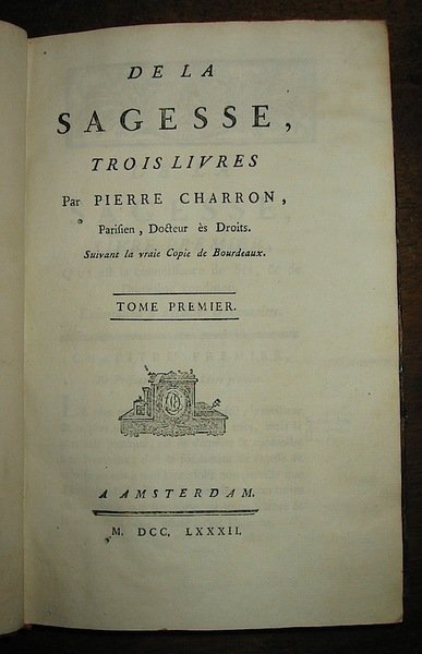 8vo (cm. 20), 2 Voll., 2 cc.nn., 451 pp.; 2 cc.nn., 315 pp. Belle legature coeve in mz. pelle con nervi, fregi e fili oro con titolo su tassello rosso al ds. (piccola abrasione alla cuffia superiore del secondo volume). Tagli rossi. Forellini di tarlo ininfluenti nel primo vol., ma esemplare freschissimo ed in ottime condizioni generali. Edizione tarda ma ben curata della principale opera di Charron (prima edizione 1601), seguace e amico di Montaigne. Quest’opera, incline al materialismo e al primato della ragione ebbe un grande successo e non fu bloccata neppure dall’intervento censorio del 1605.