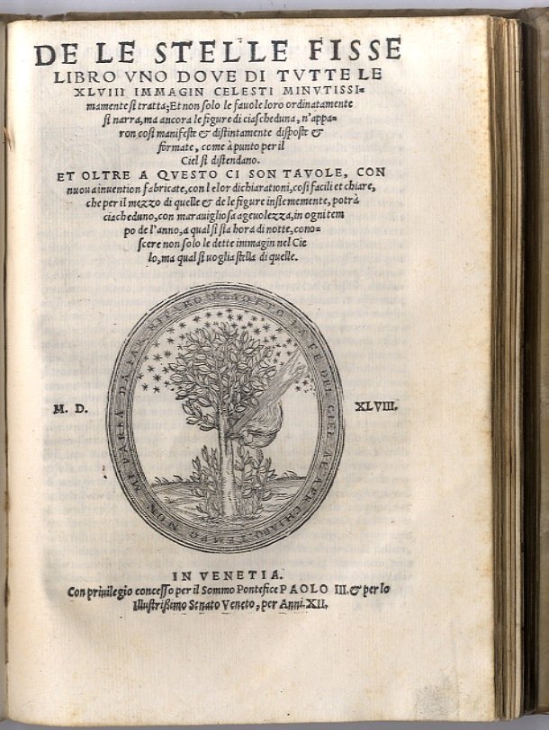 De la Sfera del Mondo, libri quattro in lingua toscana... contengono in se tutto quel ch'intorno à tal materia si possa desiderare...(segue:) De le Stelle Fisse, libro uno con le sue Figure e con le sue Tavole...conoscere qualunque stella de le 48 imagini del cielo stellato... in che parte del cielo si trovino...