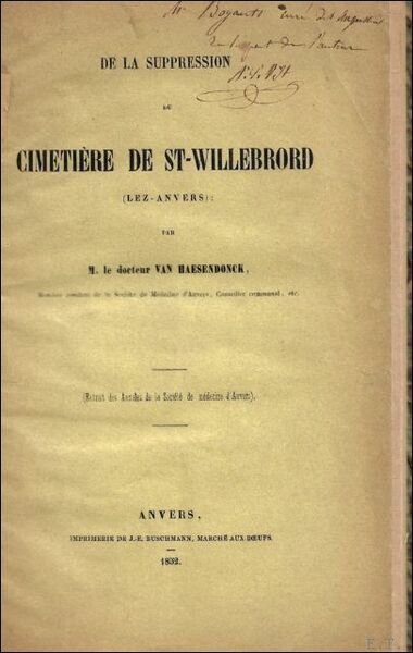 DE LA SUPPRESSION DU CIMETIERE DE ST-WILLEBRORD (LEZ-ANVERS). | Libri antichi e moderni | Van Haesendonck, M.