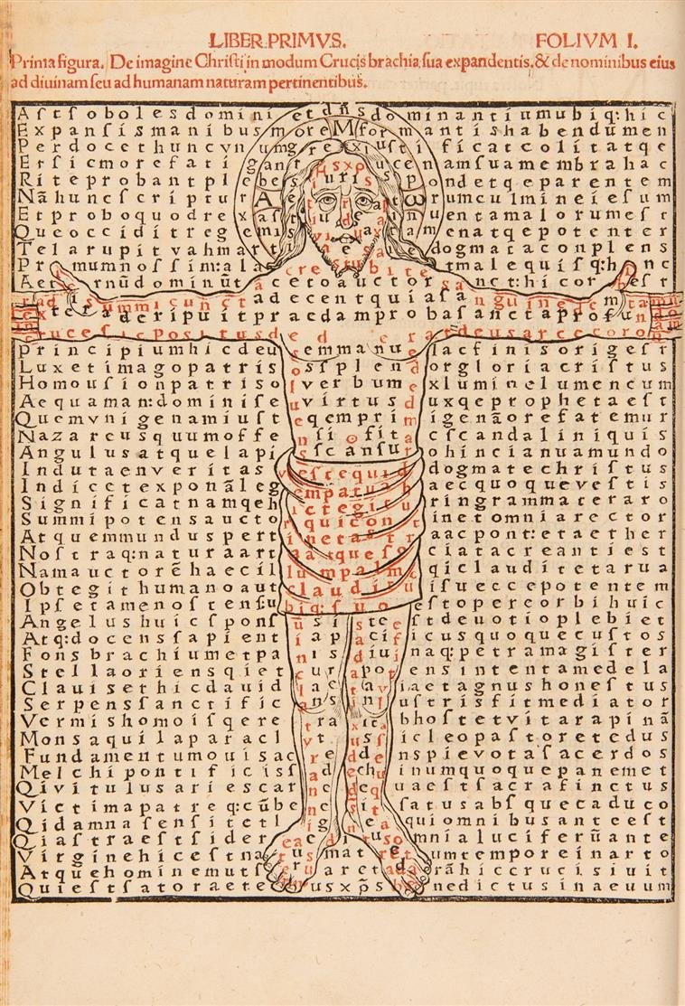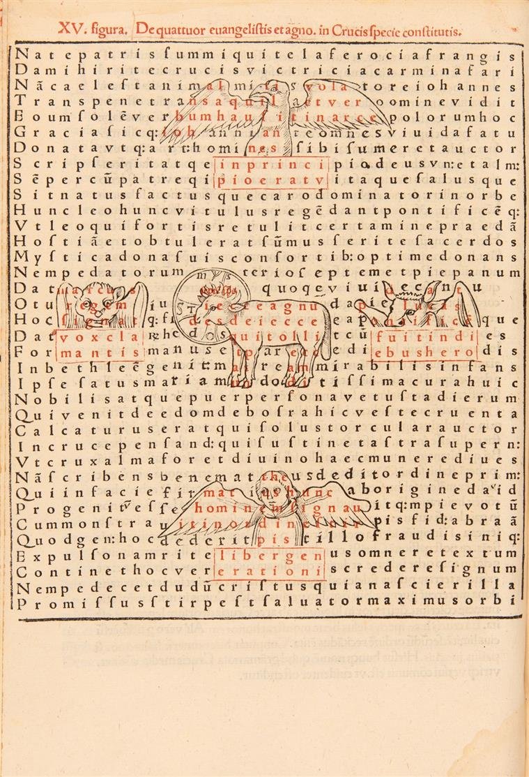 - First and only early edition of the calligrams by Fulda's Abbot, and future bishop Rabanus Maurus. Masterpiece of Thomas, Anshelm's printing press in Pforzheim it has an extraordinary, typographic impact with woodcuts and figures printed in red and, black. Bibliography: D16 H 5271 Adams R 3º Fairfax Murray, (German) 350.