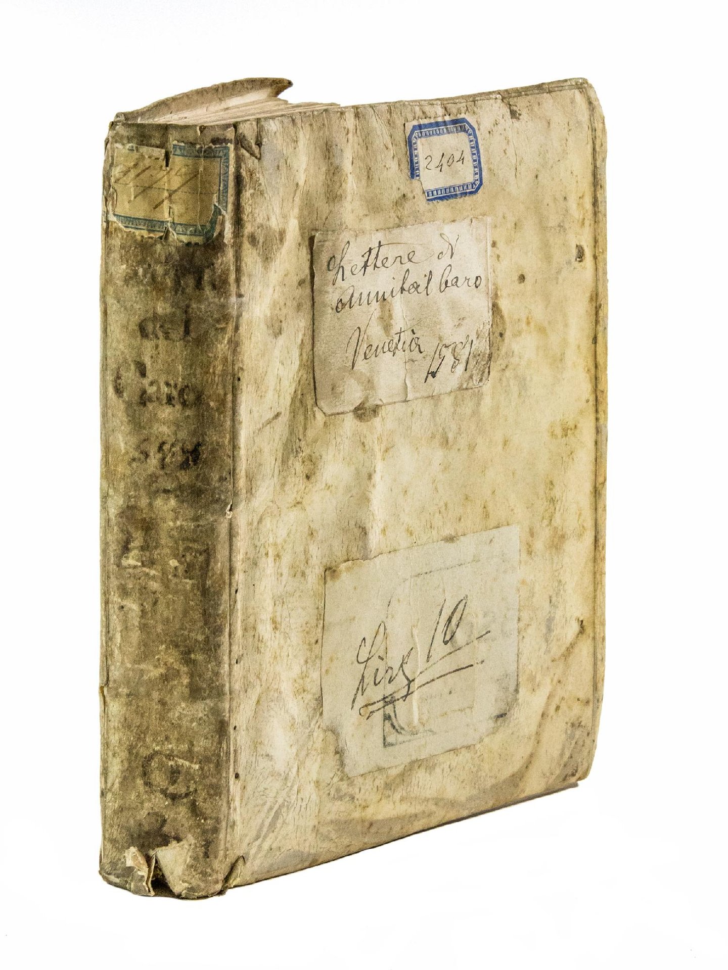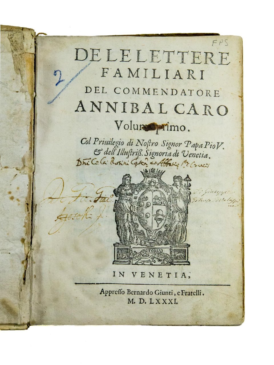 FIRST GIUNTA EDITION, second issue. In the first issue the dedications of both volumes of the first Aldine edition, printed respectively in 1572 and 1575, have been maintained: volume I was dedicated by Giovanni Battista Caro, Annibal's nephew, to cardinal Girolamo da Correggio (Rome, March 1, 1572); volume II, by Annibal's brother, Lepido, to cardinal Tolomeo Gallio (Rome, November 12, 1575). In the second issue the first quires of both volumes have been completely reset. In volume I was printed a new dedication addressed by Bernardo Giunta to Francesco Tiepolo (Venice, August 25, 1581), whereas the dedication to Tolomeo Gallio in the second was maintained. Besides that, are found new capital letters at the beginning of the text in both volumes as well as all wrong numbering of the first issue was corrected. After this first edition, Giunta reprinted Caro's letters in 1582, 1587, and 1591/2.