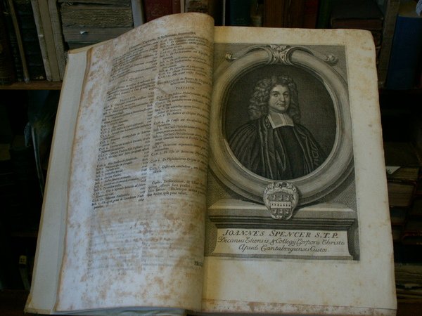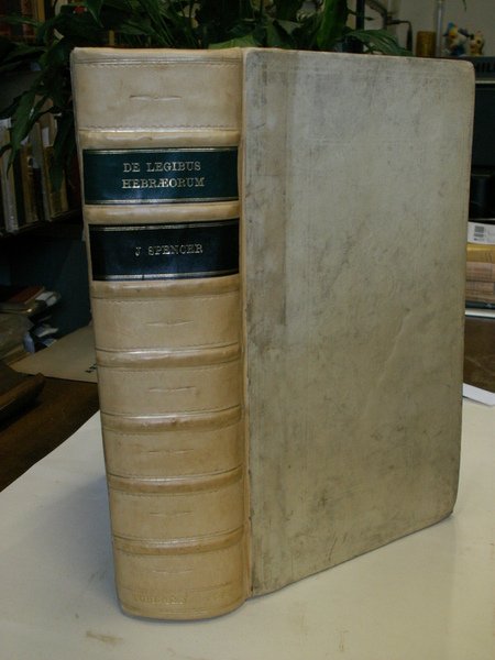 Volume in folio legato in pergamena, dorso a 5 nervi rifatto in pelle, titolo ai tasselli al dorso, sguardie, frontespizio, 18 carte, tavola in rame col ritratto dello Spencer, 1232 pp., 15 carte d'indici. La pi completa ed esaustiva opera sulle leggi, gli usi ed i costumi del popolo ebreo redatta dal profondissimo conoscitore e studioso di cose giudaiche. Davvero chiarificatrice, precisa, esauriente per richiami e ricerche su testi ebraici, latini, greci e quant'altro. Sono toccati tutti i lemmi della vita sociale, religiosa, politica, economica della complessa societ ebraica. Opera in bello stato, lamni quaderni ed in singole carte una brunitura dovuta all'acidit degli inchiostri. Poche ed ininfluenti le mende d'uso, eccellente e poderosa opera scarsamente reperibile.