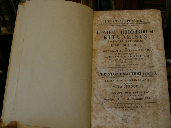 DE LEGIBUS HEBRAEORUM RITUALIBUS EARUMQUE RATIONIBUS LIBRI QUATUOR . in qua liber quartus varia capita & dissertationes aiaque autoris supplementa accessere, accurate efformata Praemittitur dessertatio praeliminaris de vita Spenceri .