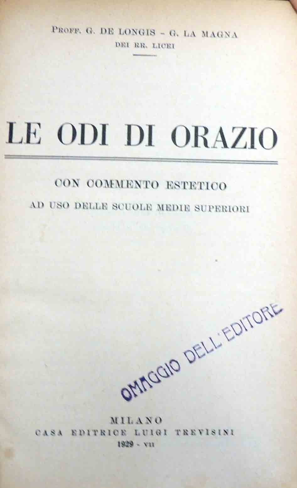 G. De Longis, G. La Magna, Le Odi di Orazio. Con commento estetico ad uso delle scuole medie superiori, Casa Editrice Luigi Trevisini, Milano 1929, pp. 188, cm 19, legatura coeva in mezza tela blu con titoli in oro al dorso e angoli. Testo in lingua latina con introduzione e commento in lingua italiana. Al frontespizio, timbro: Omaggio dell’editore. Leggere tracce d’uso, tenue brunitura della carta, per il resto bell’esemplare.