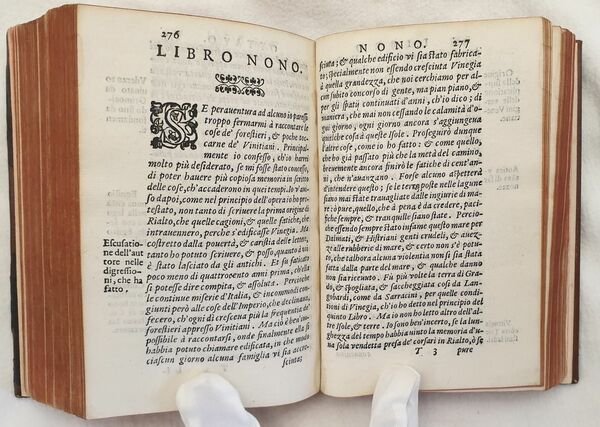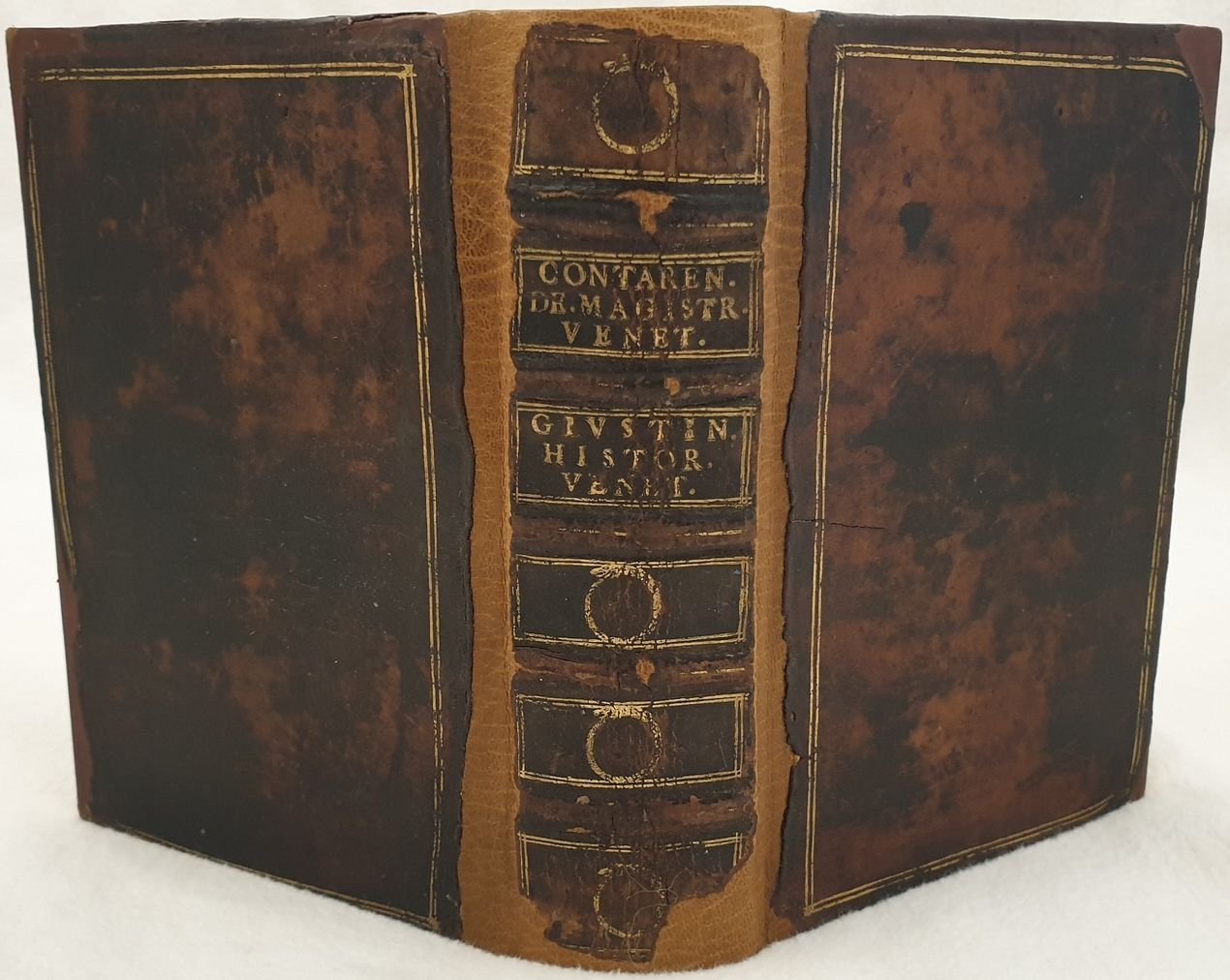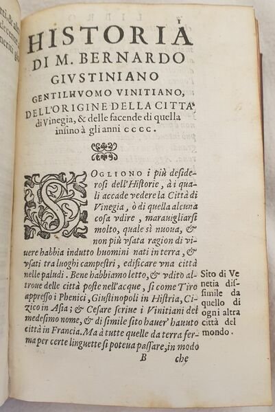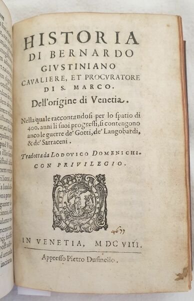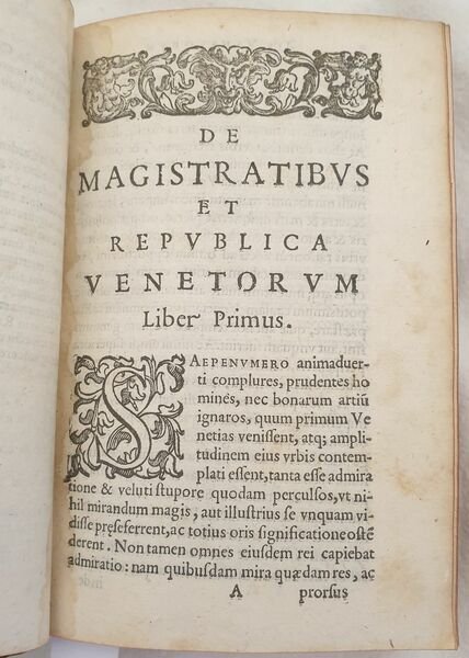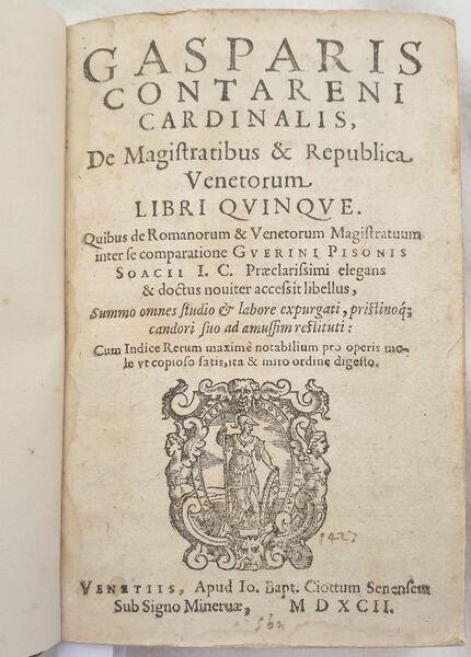 Interessante raccolta di due opere sulla storia di Venezia. La prima è l'edizione del 1592 della celebre opera "De magistratibus et Republica Venetorum" di Gaspare Contarini (1483-1542) nobile veneto, tra le più antiche e illustri della Repubblica. L'autore descrive con precisione le istituzioni della Repubblica a lettori non veneziani. La sua opera diffuse il mito di Venezia in tutta Europa. La seconda è l'edizione del 1608 dell'opera sulla storia di Venezia di Bernardo Giustiniano cavaliere e procuratore di San Marco, un importante figura nella società e politica veneziana. L'opera descrive la storia di Venezia dalla fondazione fino al 400. Traduzione a cura dell'umanista, traduttore, editore poligrafo ed erudito piacentino Lodovico Domenichi (1515-1564). In buone condizioni e completo. Copertina in piena pelle con titolo in oro al dorso in buone condizioni con lievi usure ai margini e dorso. La copertina è stata restaurata. Legatura in buone condizioni. Pagine in buone condizioni con fioriture. Piccola galleria di tarlo dalla carta 505 dell'ultima opera fino alla fine. In 16 cm 15,5x10,5. Pp. (24)+156, (32)+519+(28). Interesting collection of two works about the history of Venice. The first one is the edition of 1592 of the famous work "De magistratibus et Republica Venetorum" by Gaspare Contarini (1483-1542) venetian nobleman, the most ancient and illustrious figures of Republic. The author describes in a careful way the Institutions of Republic to non venetian readers. His work spreaded the myth of Venice in the whole Europe. The second one is the edition of 1608 of the work about the history of Venice by Bernardo Giustiniano knight and lawyer of San Marco, an important figure in venetian society and politics. The work describes the history of Venice from its establishment until 1400. Translation by the humanist, translator, editor polygrapher and scholar from Piacenza Lodovico Domenichi (1515-1564). In good conditions and complete. Full leather cover with gilted title in the spine in good conditions lightly worn in the extremities. the cover has been restored. Binding in good conditions. Pages in good conditins with foxing. Little worming from page 505 of the last work until the end. In 16 cm 15,5x10,5. Pp. (24)+156, (32)+519+(28).