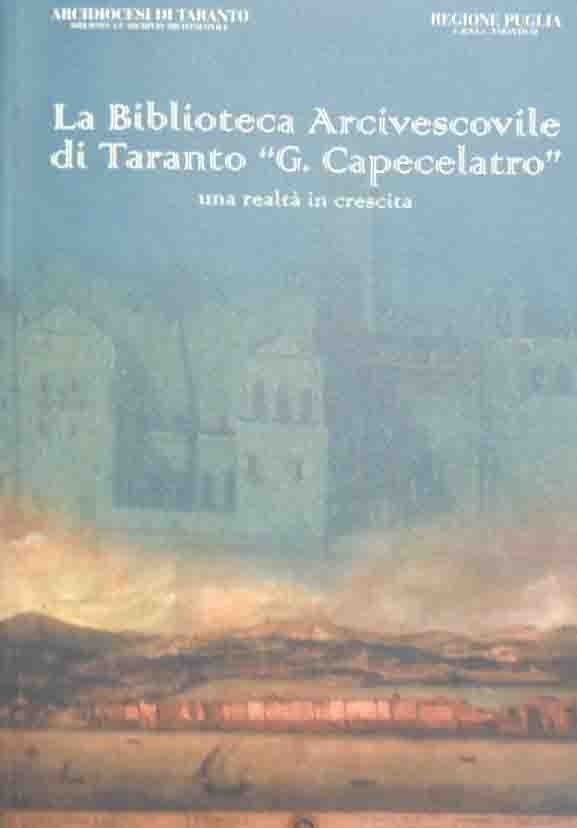 Vittorio De Marco et al., La Biblioteca Arcivescovile di Taranto G. Capecelatro. Una realtà in crescita, s.n., Tarenti (Taranto) 2000, pp. XI, 224, ill. b.n., cm 30, br. ed. In testa al frontespizio: Arcidiocesi di Taranto (Biblioteca e Archivio Arcivescovile), Regione Puglia (C.R.S.E.C. Taranto/52). Indice: Presentazioni – V. De Marco, La Biblioteca Arcivescovile di Taranto nel cuore del Centro Storico – G. Blandamura, L’Episcopio di Taranto (a cura di V. De Marco) – P. D. Solito, La famiglia Capecelatro – A. Galbiati, Mons. Giuseppe Capecelatro: un illuminista nella Diocesi di Taranto – O. A. Stasi, Le Istruzioni Pratiche sullo zucchero di Giovanbattista Gagliardo, agronomo tarantino – D. Foresio, La vita musicale a taranto al tempo di Capecelatro – M. Accattatis et al., Il Fondo Antico. Qulache annotazione sulle edizioni del XVII e XVIII secolo – Appendice. Perfetto.
