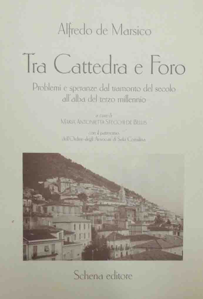 Alfredo De Marsico, Tra cattedra e foro. Problemi e speranze dal tramonto del secolo all’alba del terzo millennio, a cura di Maria Antonietta Stecchi De Bellis, con il patrocinio dell’Ordine degli Avvocati di Sala Consilina, Schena Editore, pp. 119, ill. b.n., cm 24, br. ed. Minime tracce d’uso alla brossura, per il resto ben conservato.