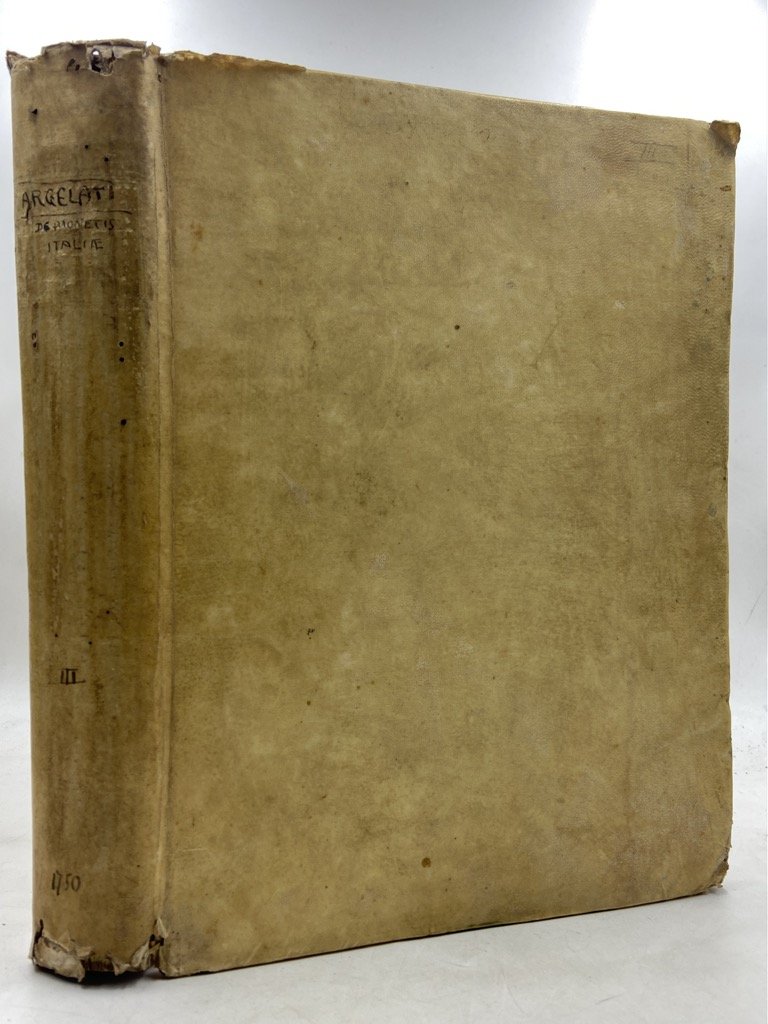 Legatura coeva in pergamena rigida con piccoli difetti sui bordi e titoli manoscritti posteriormente, in folio piccolo cm 29 x 23, pp (4) 147 (1) (4) 137 (1) 46 + XVI tavole. Mancante l’occhietto. Discreto stato. Il solo terzo volume dell’importante antologia di dissertazioni e trattati di numismatica ed economia curata da Filippo Argelati per la Società Palatina. Concepita quale integrazione agli Scriptores di Muratori, l’opera si componeva di quattro tomi, cui seguirono dopo la morte dell’Argelati due volumi di appendice curati da Montanari e Casanova. Questa terza parte contiene il Trattato del valore delle monete in tutti gli stati di Geminiano Montanari (Modena 1633 - Padova 1687), la dissertazione sui sigilli del Medio Evo di Ludovico Antonio Muratori (in latino), scritti in latino e italiano sulle monete venete (Girolamo Zanetti), ravennati (Pinto), milanesi, e «variarum urbium» (Argelati), sul commercio (Belloni), documenti antichi, e accurati indici. Uno dei classici della numismatica italiana, che pose «le basi per in modo molto esauriente per una completa indagine» sulle molte zecche italiane. (Bassoli, p. 63).