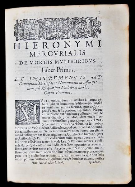 In 4° (23×17 cm); (24), 236 pp. Solida legatura in mezza pergamena. Pergamena a palinsesto ebraico sbiadito. Piatti foderati in carta allinizio del novecento. Al dorso fascetta in pelle con titolo impresso in oro. Piccolo ed insignificante restauro al margine esterno delle prime tre carte (piccola aggiunta sottilissima di pasta di carta, insignificante). Testatine, finalini e iniziali ornati. Grande marca tipografica con giglio di Giunta al frontespizio. Leggerissimo ed insignificante antico alone dumidità al margine esterno bianco delle prime 100 pagine, sempre lontano dal testo e mai intenso. Terza edizione (ma seconda in forma di volume singolo dopo che lopera era uscita allegata ad altro volume nel 1586 e per la prima volta in versione singola nel 1587) che si fa preferire alle precedenti per le correzioni e le aggiunte, di questo celebre studio di ostetrica e ginecologia del grande medico e filosofo forlivese, Girolamo Mercuriale, celebre per avere per primo teorizzato luso della ginnastica su base medica. Suoi sono anche il primo trattato sulle malattie cutanee ed unimportante opera di pediatria. Dopo aver studiato medicina allUniversità di Bologna ed aver conseguito nel 1555 la laurea allUniversità di Padova, dove ebbe modo di conoscere personalmente il medico veneziano Vettor Trincavella, seguì a Roma il Gran Cardinale Alessandro Farnese. A causa della sua fama, infatti, i forlivesi lo inviarono come legato presso il papa Pio IV, dove rimase sette anni. Fu poi professore di medicina pratica in entrambe le università dove aveva studiato. A Padova, in particolare, tra il 1569 ed il 1587, trascorse un periodo molto fecondo, in cui scrisse ben dodici libri, alcuni dei quali basati sugli appunti presi dagli studenti durante le lezioni. Si recò poi a Pisa, dove divenne primo medico di Ferdinando I de Medici e poté godere di una certa fama come clinico. Curò anche altre importanti personalità del suo tempo, tra cui limperatore Massimiliano II, che lo nominò cavaliere e conte palatino. Bibl.: Wellcome, 4248; Durling, n. 3098.
