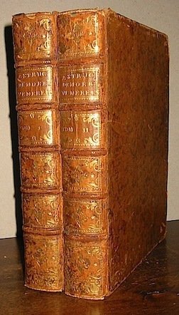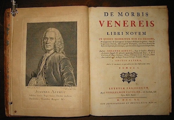4to (cm. 25,3), 2 Voll., 2 cc.nn., ritratto dell’A. in antiporta, XXXVI-536 pp., da p. 537 a p. 608; 2 cc.nn., da p. 537 a p. 1196(2). Frontis. in rosso e nero. Bella legatura coeva in piena pelle maculata con nervi, ricchi fregi e titolo oro al ds. Tagli rossi. Angoli e cuffie consumati, altri lievi segni d’usura, ma bell’esemplare. Edizione accresciuta e con due nuove Dissertazioni. Garrison-Morton, 5195; Wellcome II, 64. Astruc (1684-1766) fu professore di medicina a Tolosa, Montpellier e Parigi e la sua opera è da considerarsi un caposaldo della letteratura medica riguardante la sifilide.