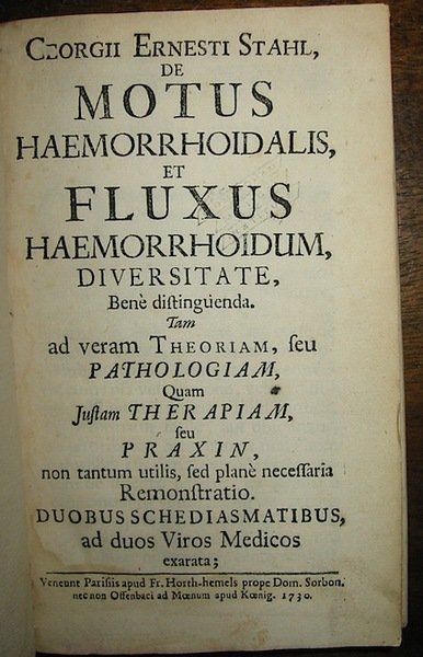 8vo (cm. 16), 16 cc.nn., 126 pp., 1 c.nn. (bianca), 65 pp. [Catalogo dei libri della Facoltà di Medicina in vendita presso lo stesso editore], 3 pp. [Errata]. Legatura recente in piena pergamena. Tagli rossi. Ottimi e freschi interni, salvo un pallido alone sulle ultime carte. Rara edizione originale. Provenienza: Birmingham Medical Institute (timbretto molto sbiadito al frontis. ed altri stinti al margine inferiore di alcune carte). Garrison-Morton, 3421: ‘A classical work on haemorrhoids’. Blake, 429.