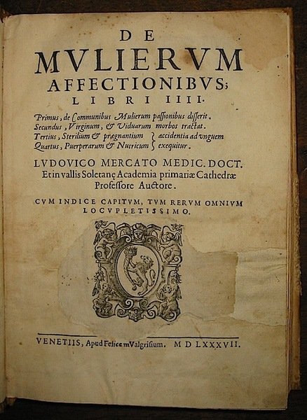 8vo (cm. 23,2), 4 cc.nn., 528 pp., 8 cc.nn. Legatura antica in piena pergamena rigida (restauri ben eseguiti). Frontespizio restaurato e con rinforzo nella parte inferiore. Lievi aloni marginali, antiche sottolineature e qualche carta brunita. Piccola bruciatura con foro sul margine esterno bianco di due carte. Sporadiche macchioline d’inchiostro. Margine superiore sobrio. Nel complesso esemplare in buone condizioni di quest’opera molto rara e di grande successo del chirurgo spagnolo De Mercado (1520-1606), medico personale di Filippo II e quindi di Filippo III. La prima edizione fu pubblicata a Valladolid nel 1579. Oltre a questa rarissima edizione veneta (che sarà poi fedelmente ristampata sempre a Venezia da Giovanni Guerigli nel 1597), si conoscono altre edizioni uscite in diversi luoghi d’Europa: Basilea (1584 e 1588), Madrid (1594), Venezia (1602), Valladolid (1604 e 1605). Wellcome I, 4209; Durling, 3074; Adams, M1502. Non in Br. Libr. e Garrison & Morton.
