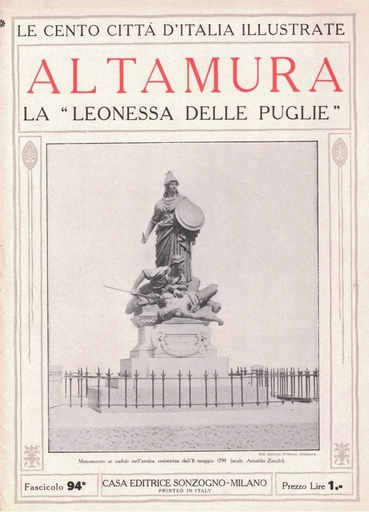 Giuseppe De Napoli, Altamura. La Leonessa delle Puglie, Casa Editrice Sonzogno, Milano s.d. (ma 1925 ca.), pp. 16, riccamente ill. b.n., cm 30, rilegatura a punto metallico. Collana Le cento città d’Italia illustrate, fascicolo n. 94. Compilazione della collana a cura di Guido Vicenzoni. Monografia compilata da Giuseppe De Napoli. Foto del fascicolo di Antonio D’Alesio. Minime fioriture, leggera brunitura della carta, per il resto ottimo.