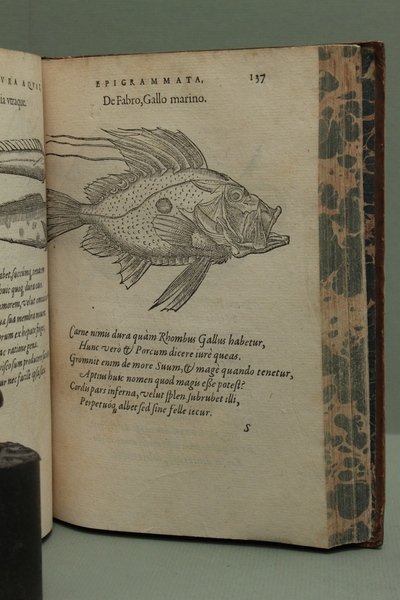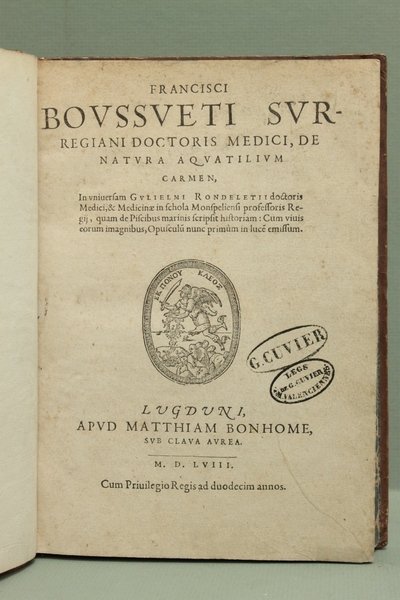 Due parti in un volume in - 4ø; 10 cc., 240 pp. - 136 pp. (i. e. 138: la 65, pi— grande e ripiegata, Š contata come carta), con ritratto dell'autore e oltre 400 illustrazioni xilografiche nel testo. Legatura settecentesca in tutta pelle, tassello in marocchino con titolo e fregi floreali in oro al dorso, triplice filetto in oro ai piatti, tagli marmorizzati. Buon esemplare appartenuto al celebre biologo e naturalista Georges Cuvier (1769 - 1832) e da lui donato allo zoologo Achille Valenciennes (1794 - 1865): doppio ex libris a timbro al frontespizio. Altro ex libris recente al contropiatto anteriore. Esemplare appartenuto al celebre naturalista George Cuvier (1769 - 1832) della prima edizione di uno dei pochi libri del Cinquecento interamente dedicati ai pesci e agli animali d'acqua dolce e salata. Utilizzando anche questo libro come fonte, Cuvier forn? la pi— importante iconografia sui pesci pubblicata nel corso del XIX secolo nella sua "Histoire naturelle des poissons" (1828 - 1849), scritta insieme allo zoologo francese Achille Valenciennes, al quale poi questo stesso esemplare venne lasciato in eredit… (cfr. ex libris). Il volume Š illustrato da oltre 400 xilografie attribuite all?incisore lionese Georges Reverdy (attivo tra il 1529 ed il 1565). Sia le illustrazioni che l'impianto del libro derivano dall'opera sui pesci di Guillaume Rondelet stampata sempre a Lione pochi anni prima (1554 - 1555). Ad ogni animale corrisponde un epigramma latino che spesso riporta anche interessanti notizie di carattere gastronomico (Paleari) o medico nutrizionale (Wellcome, Durling). Nissen I, 58. Nissen (Fischbuecher) 31. Mortimer, Harvard French, 118. Wellcome 1018. Durling 660 (incompleto). Paleari 50. Baudrier X, p. 257.
