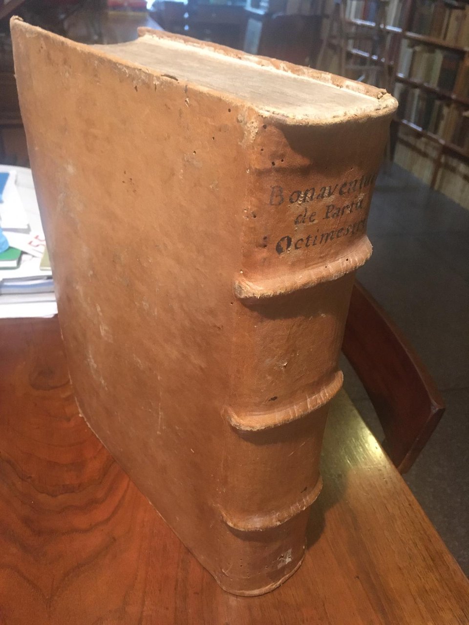 In-folio (325x220mm), pp. (128), 944 + (12), 40 di 'De Octomestris Partus Natura adversus vulgatam opinionem peripatetica disputatio', con occhietto autonomo. Legatura coeva in p. pelle bionda con titolo calligrafato in antico su dorso a tre nervi rilevati. Il primo frontespizio è in rosso e in nero. Vignetta calcografica al primo frontespizio incisa da Luca Ciamberlano con stemma del dedicatario, il Duca di Urbino Francesco Maria II Della Rovere, sormontato da corona sorretta da putti che cingono ramoscelli floreali nelle mani. Testo bicolonne. Capilettera xilografici ornati. Amplissimi indici preliminari. Sparsi aloni, più marcati ai margini, e fioriture. Ex-libris nobiliare antico della famiglia Vinci al verso del frontespizio. Forellini di tarlo rimarginati ai piatti. Sguardie rinnovate. Bellì'esemplare. Prima edizione di questo zibaldone medico (ma con agganci relativi a numerose altre discipline, dalla filosofia di matrice aristotelica al diritto all'astrologia) del celebre poligrafo anconetano, noto soprattutto per i 4 libri Della ragion di Stato e della prudenza politica (1623), diretti polemicamente contro l'omonimo trattato del Botero. Scrive Luigi Firpo a proposito della presente opera: 'Nell'autunno del 1599 diede l'ultima mano all'opera sua di maggior mole: le mille pagine in folio del De natura partusoctomestris, replica a uno scritto di egual titolo che il medico Girolamo Bertolini gli aveva dedicato il 12 dicembre 1594. Stampata a Urbino da Ragusio nel 1600, rimessa in circolazione dal Ciotti a Venezia sotto un frontespizio fittizio nel 1602 e a Francoforte nel 1612, l'opera ebbe una qualche diffusione per i quesiti medici, giuridici e astrologici che affrontava, ma non si staccava dalle altre compilazioni del Bonaventura, soffocanti e smisurate. Era talmente prolissa che il Bonaventura si sentì in obbligo di stenderne un Compendium che offerse al duca il 4 maggio 1600 e che il tipografo avveduto stampò in calce all'immane tomo per comodo dei lettori più sbrigativi.' (D.B.I., XI, 1969). Brunet, I, 1094. Durling, 628. Wellcome, I, 965. Adams, B-3282. Manca a STC Italian